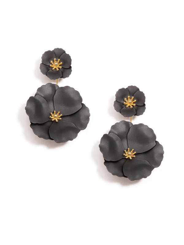 So much glamour packed in these flowers! These drop earrings are designed as a 2-piece jacket style and feature two metallic 3D hand-painted flowers with 18k gold-plated accents.