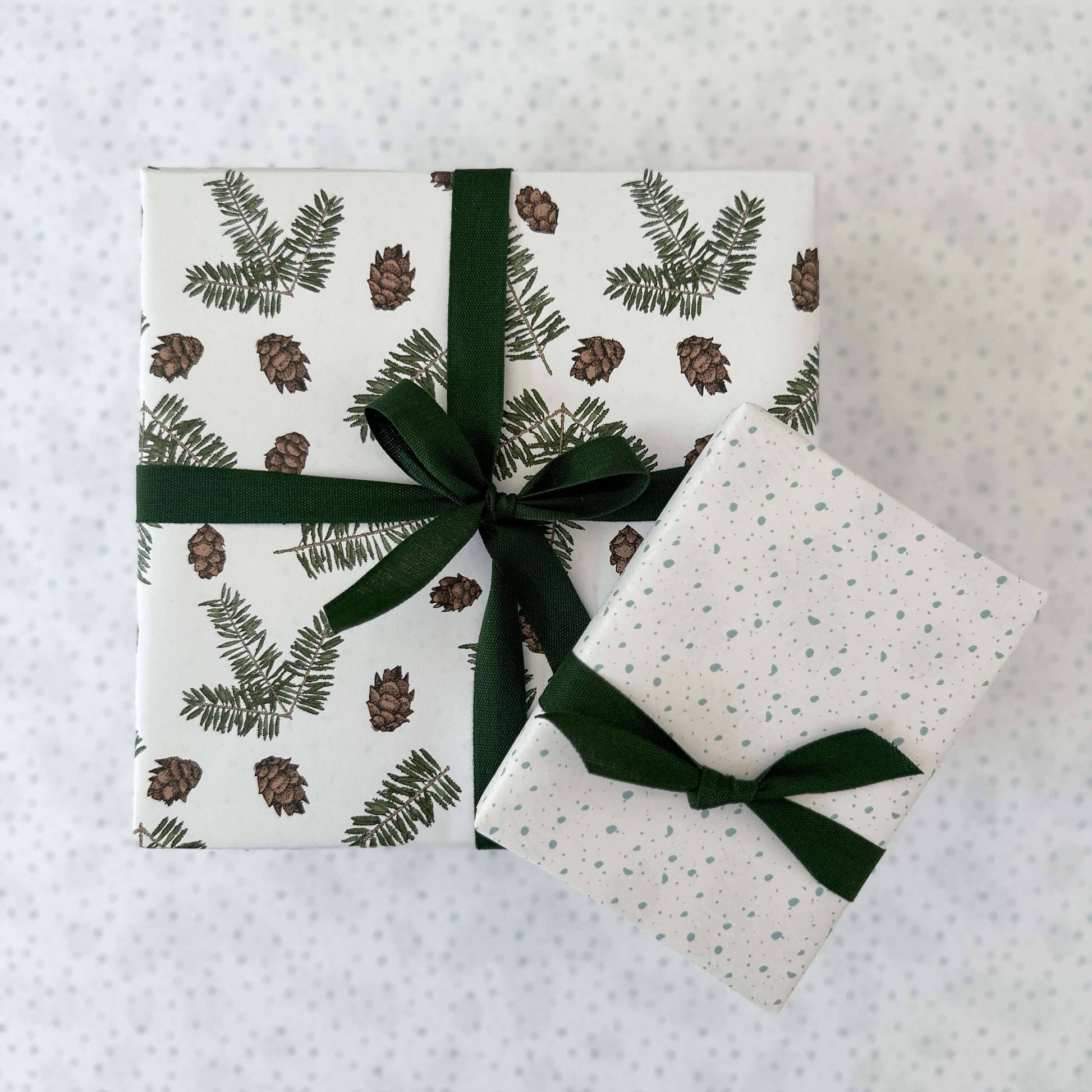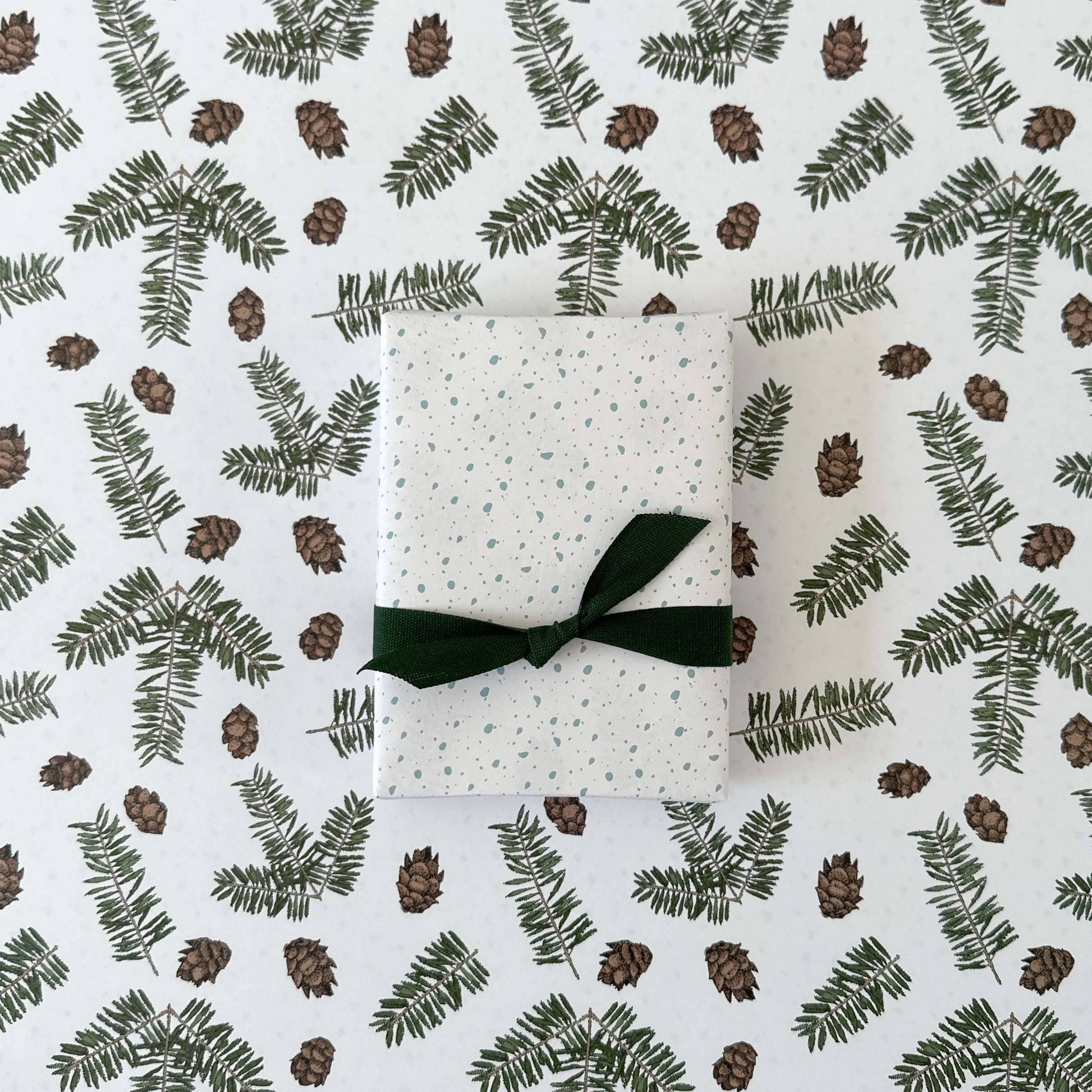 This luxury double-sided wrapping paper features small brown pine cones and deep green hemlock needles on a snow white background. The opposite side is blue snow fall on white.