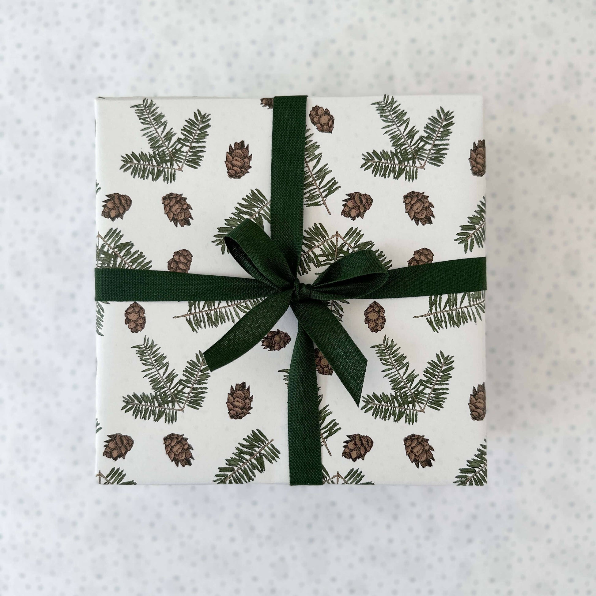 Ballard & Prescott’s Pine Cone Wrapping Paper is a charming pattern you can use throughout winter. This paper features small pine cones and hemlock boughs in soft browns and rich greens. If you are looking for a versatile wrapping paper that you can always feel proud to use, this design is perfect.