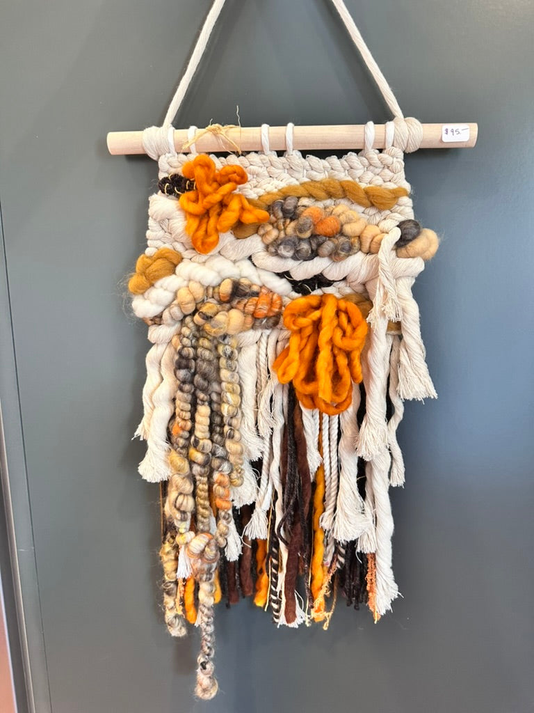 Handwoven wall tapestry made with synthetic and natural fibers, including wool, cotton, silk, linen, banana fiber, repurposed fabrics, hand dyed and hand spun yarns and more.