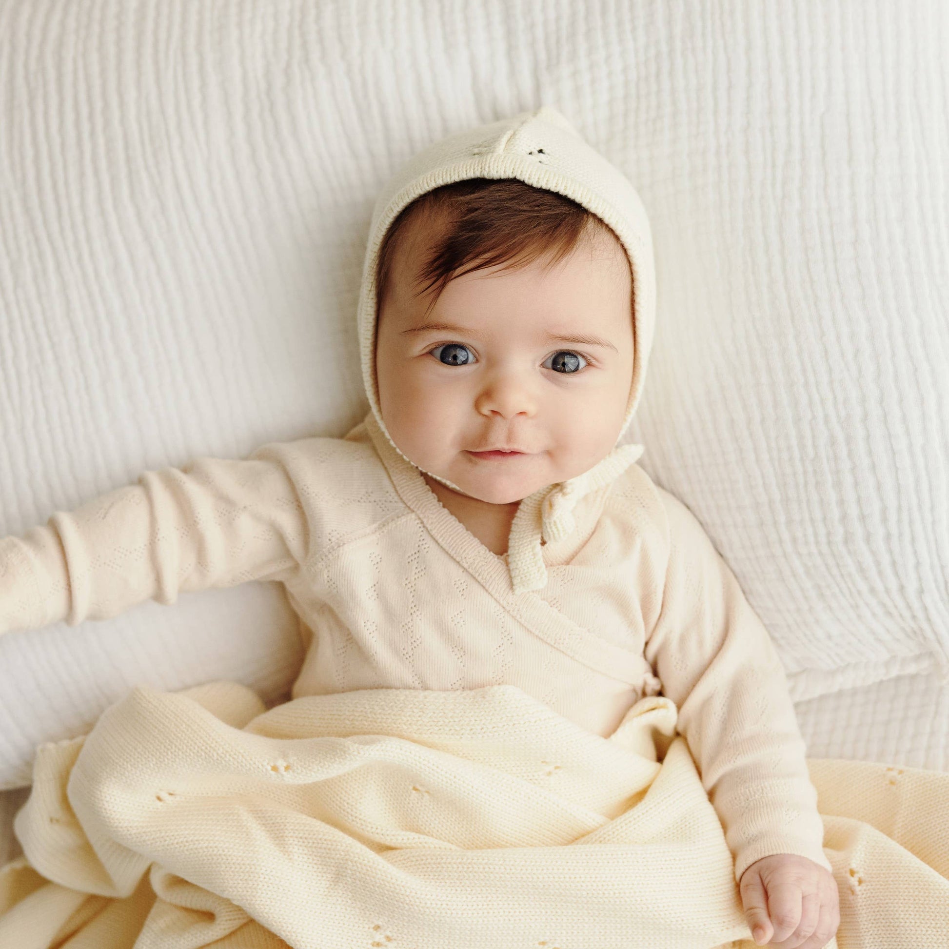 Introducing our latest collection of baby blankets and matching bonnets. Meticulously crafted for the little ones in your life. Each piece in this charming set is made from the finest organic cotton, ensuring a soft touch against delicate skin.