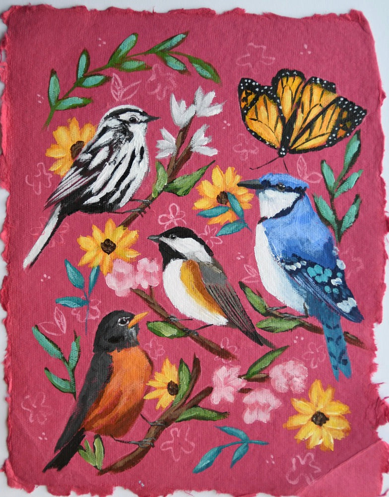 A fun original piece by Erika Pfluke, owner of Bird & Brass. This piece was painted on paper handmade in India and painted using acrylic paints. It's deckled edges continue the feeling of pattern and texture all the way to the edges. Art measures approx 8.5x11".