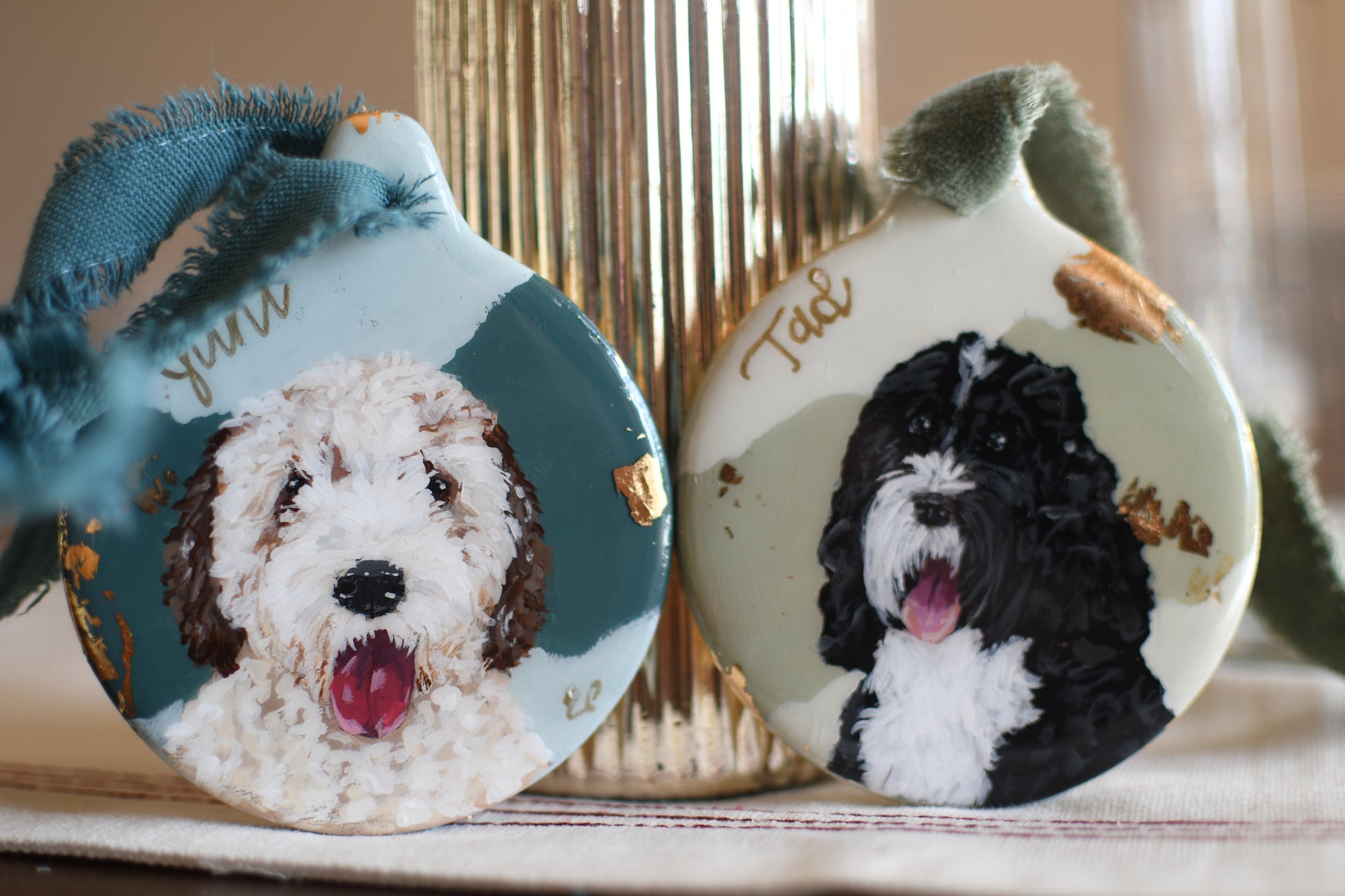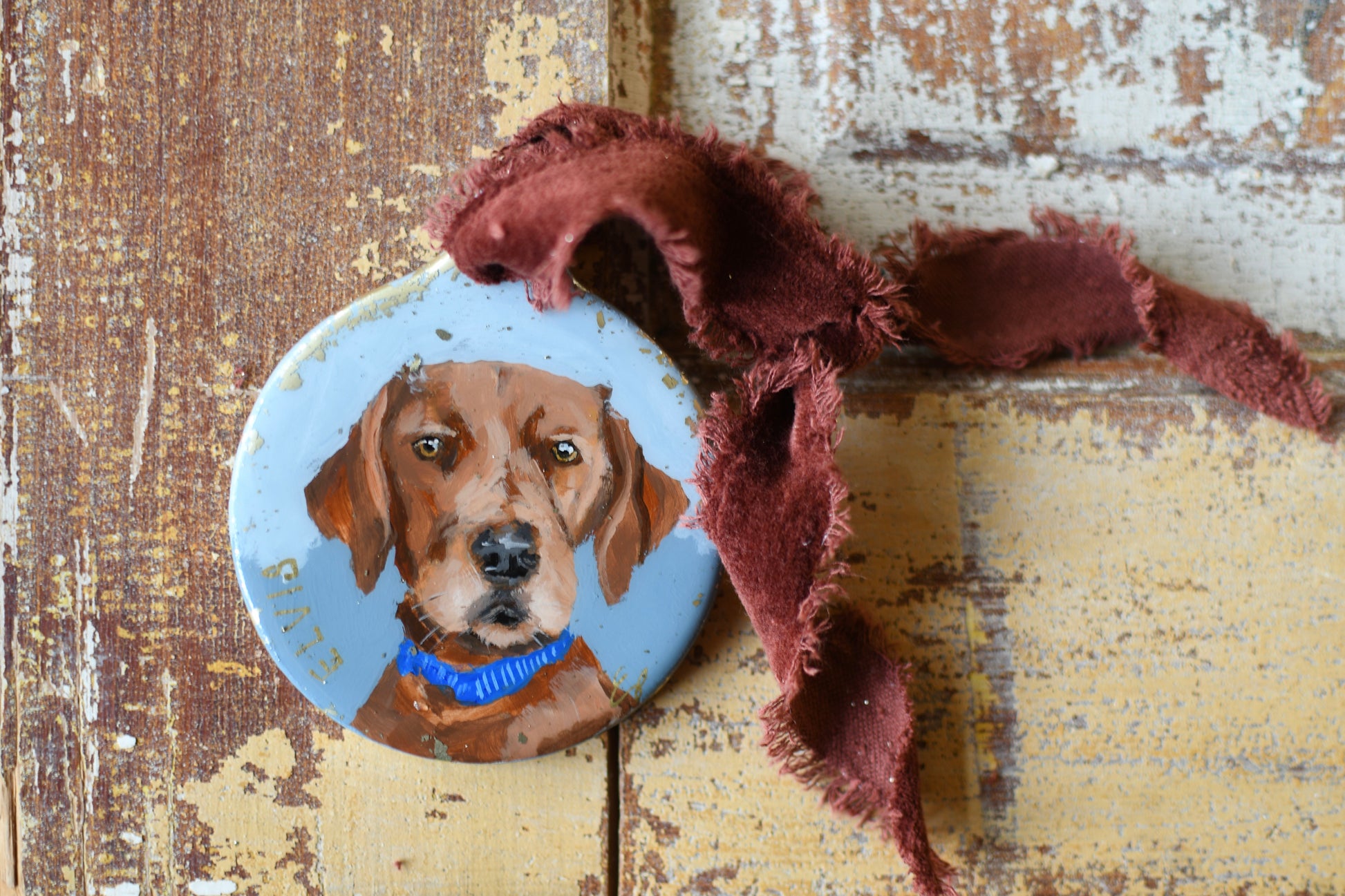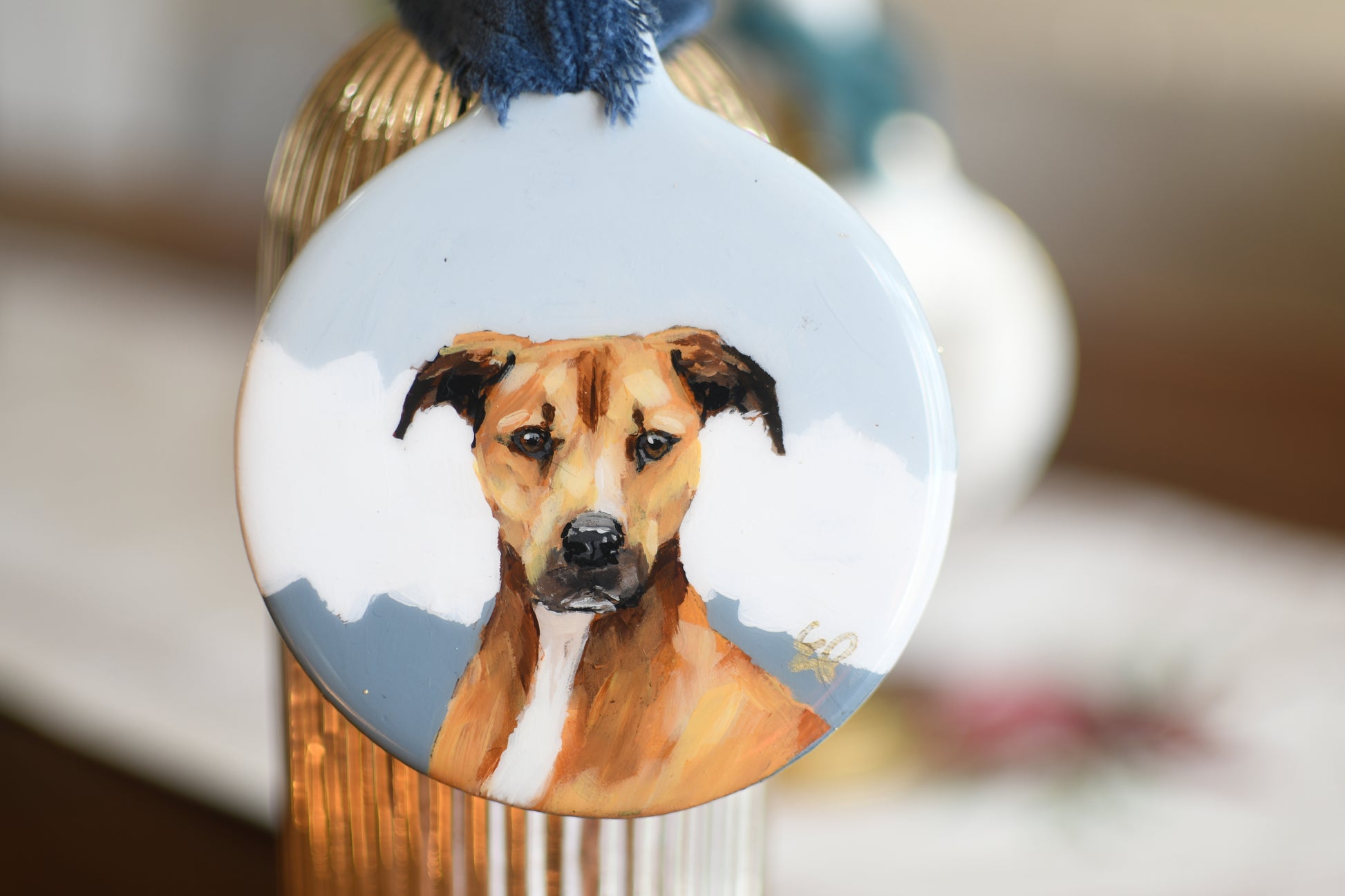 Commission a custom pet portrait on an ornament: a sweet way to treasure your furry friend. Display is not limited to Christmas. You can hang this small piece of original art in your home throughout the year. Hang on a lamp, a drawer pull, or a vase and enjoy that sweet face all year.