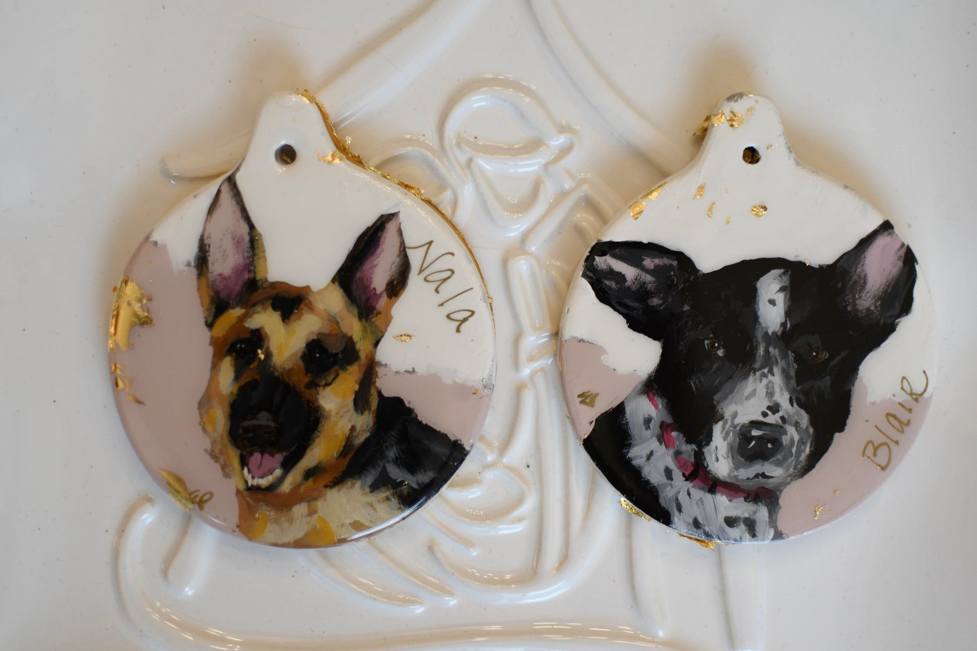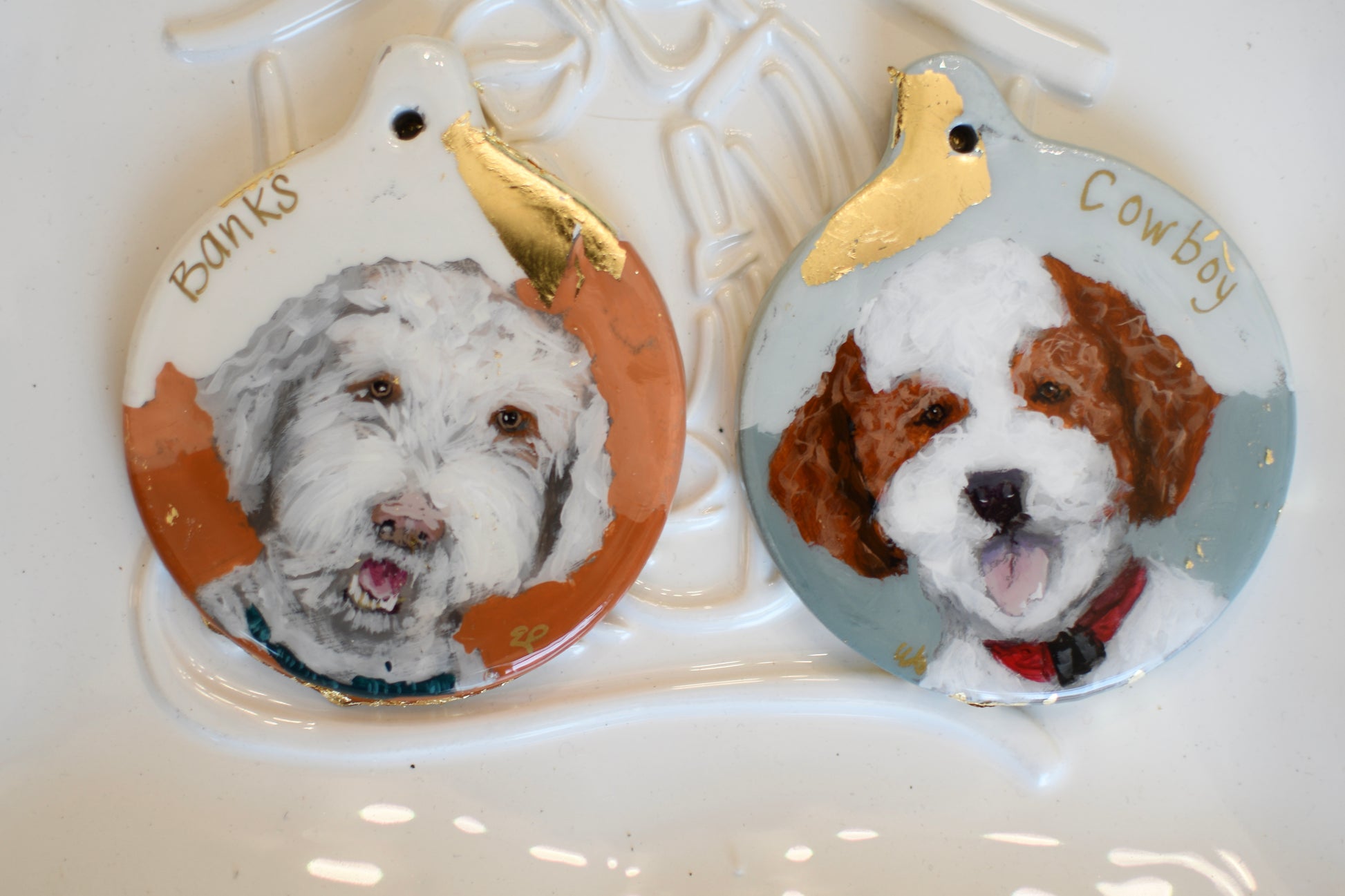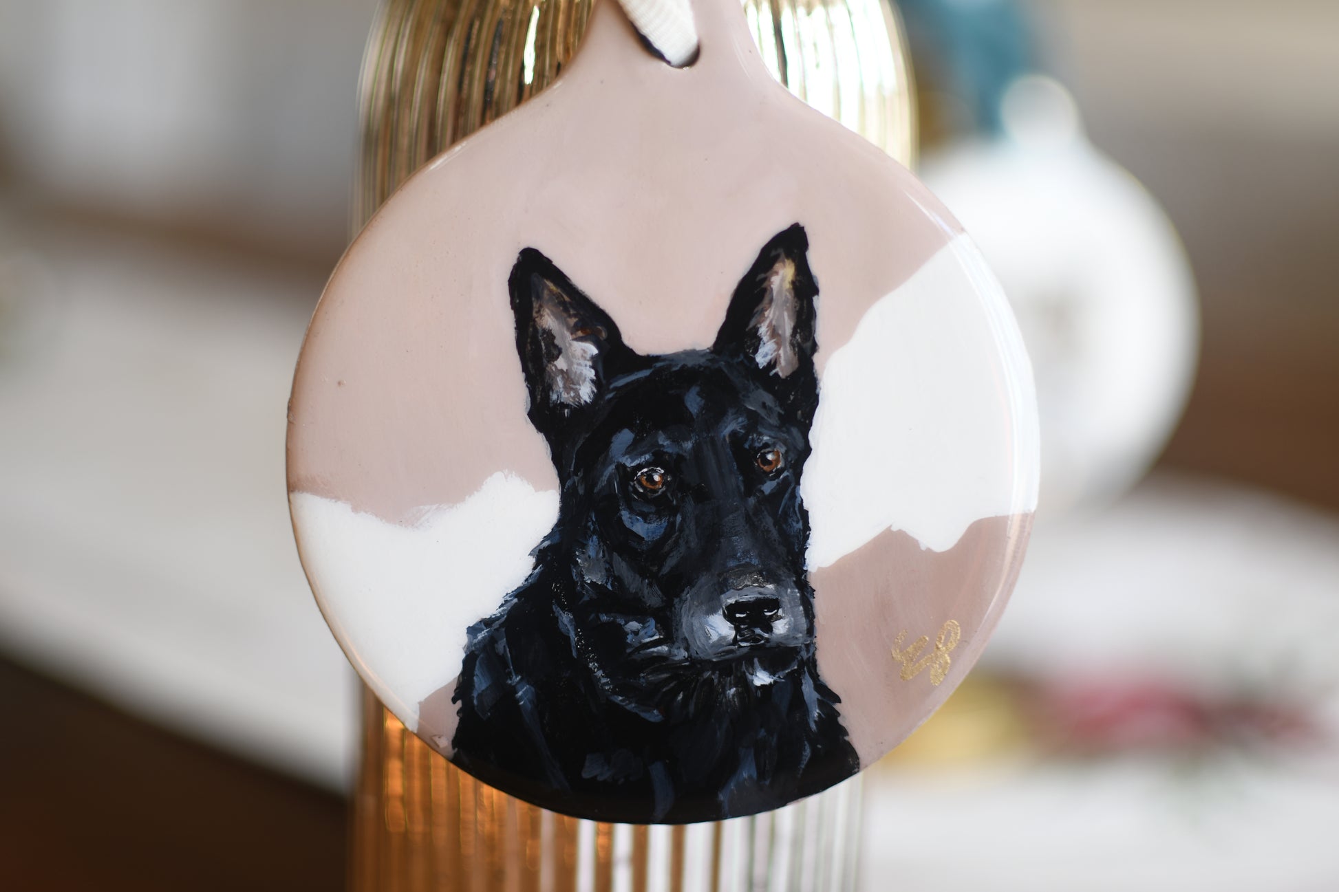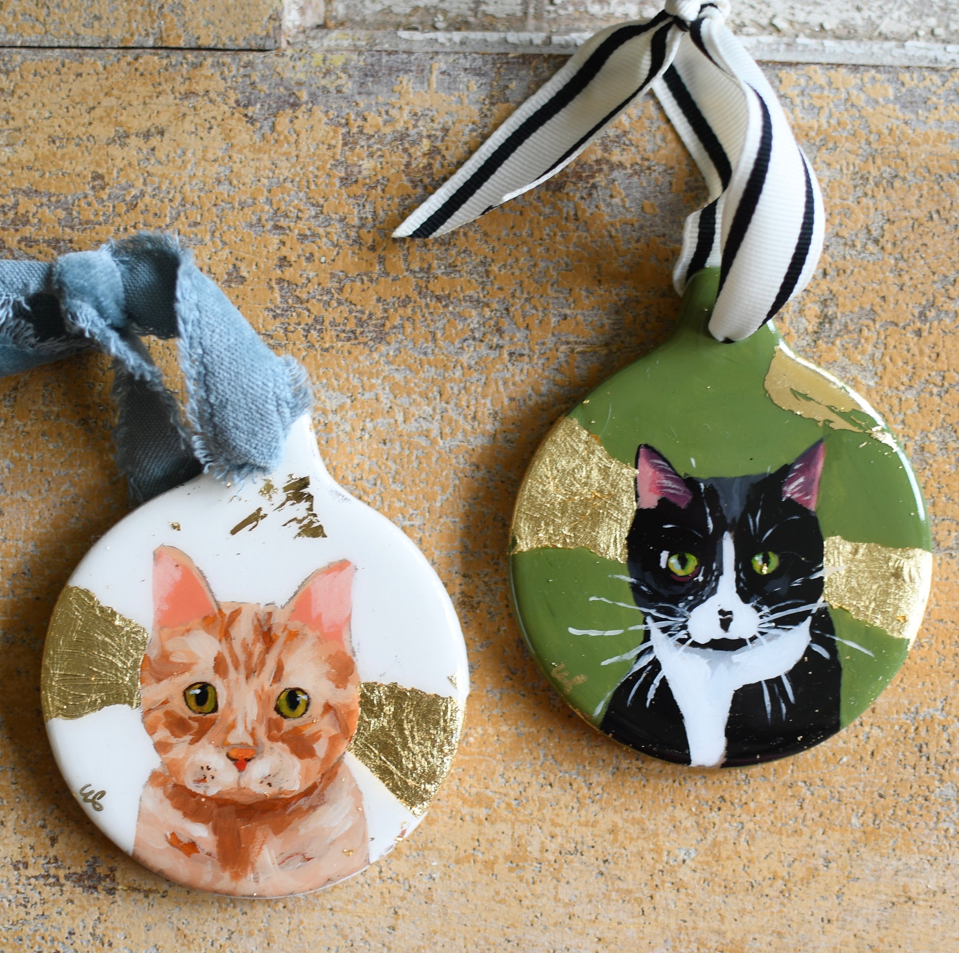 Commission a custom pet portrait on an ornament: a sweet way to treasure your furry friend. Display is not limited to Christmas. You can hang this small piece of original art in your home throughout the year. Hang on a lamp, a drawer pull, or a vase and enjoy that sweet face all year.