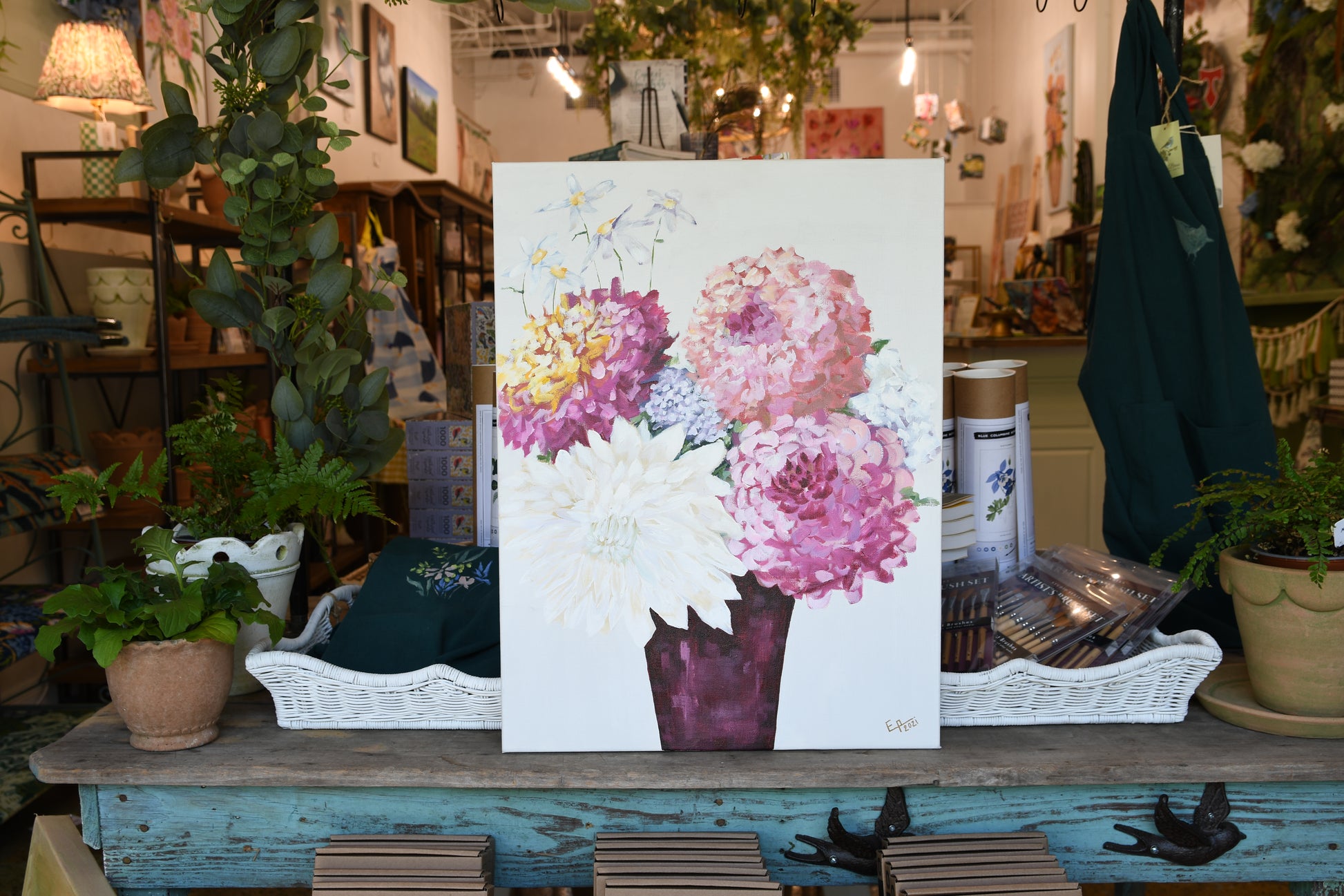 A bouquet of dahlias and daisies in shades of softened magenta, lavender and white. Acrylic on Canvas. 18x24". by Erika Pfluke