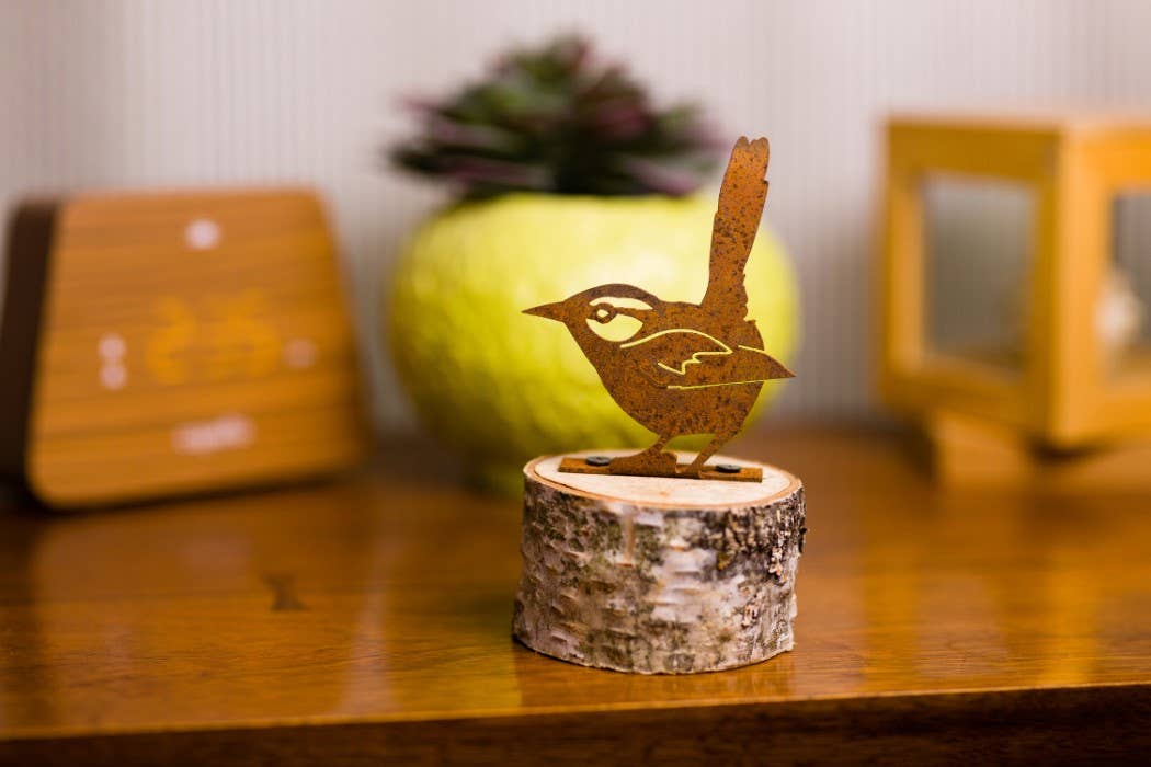 House Wren is made of recycled steel and pre-treated to create our signature rusted texture and natural look. It serves as a charming nature-inspired table centerpiece. If you have a window planter box, consider mounting your House Wren to its edge - the rusted finish looks stunning paired with vibrant plants!