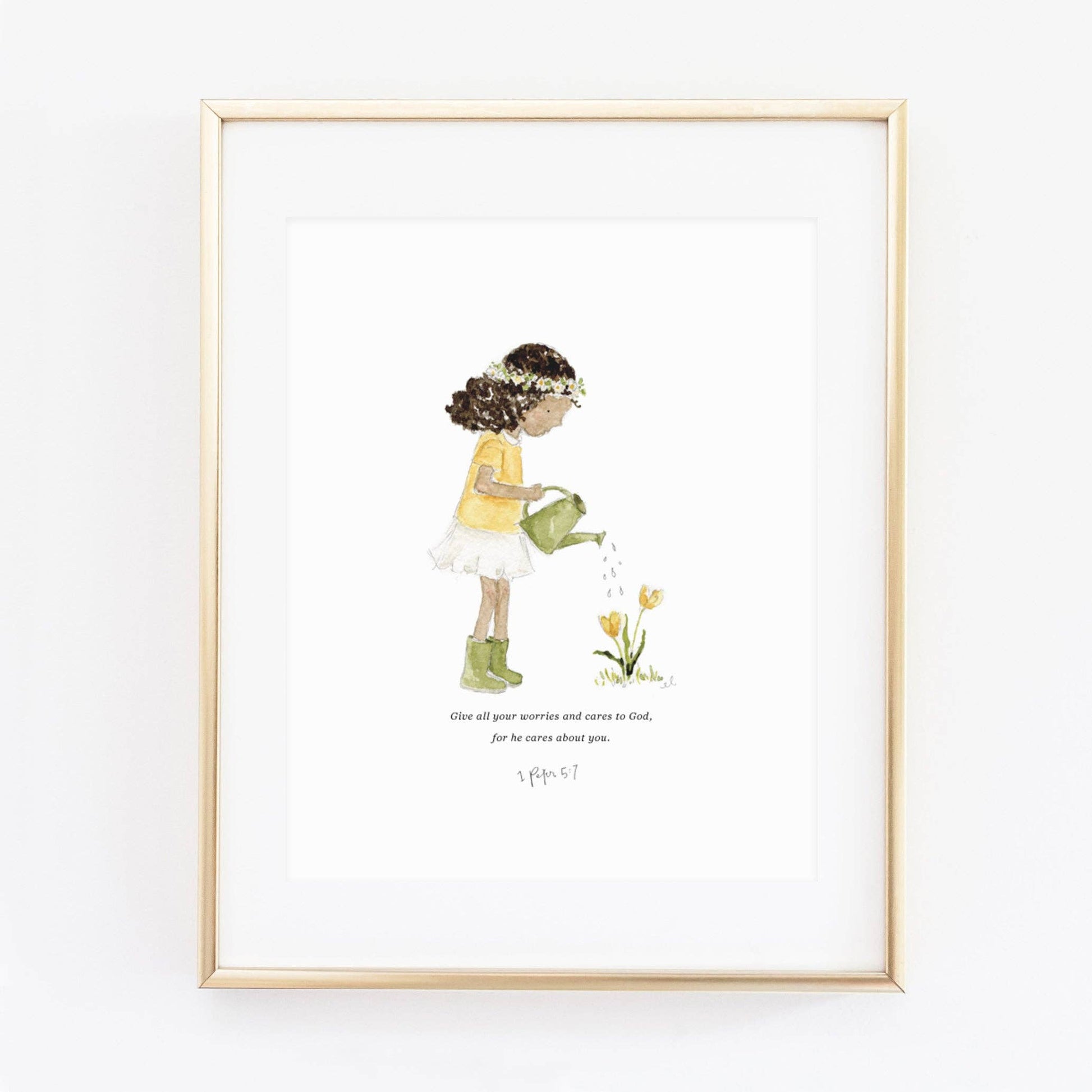 emily lex studio - 1 peter 5:7 watering girl scripture print