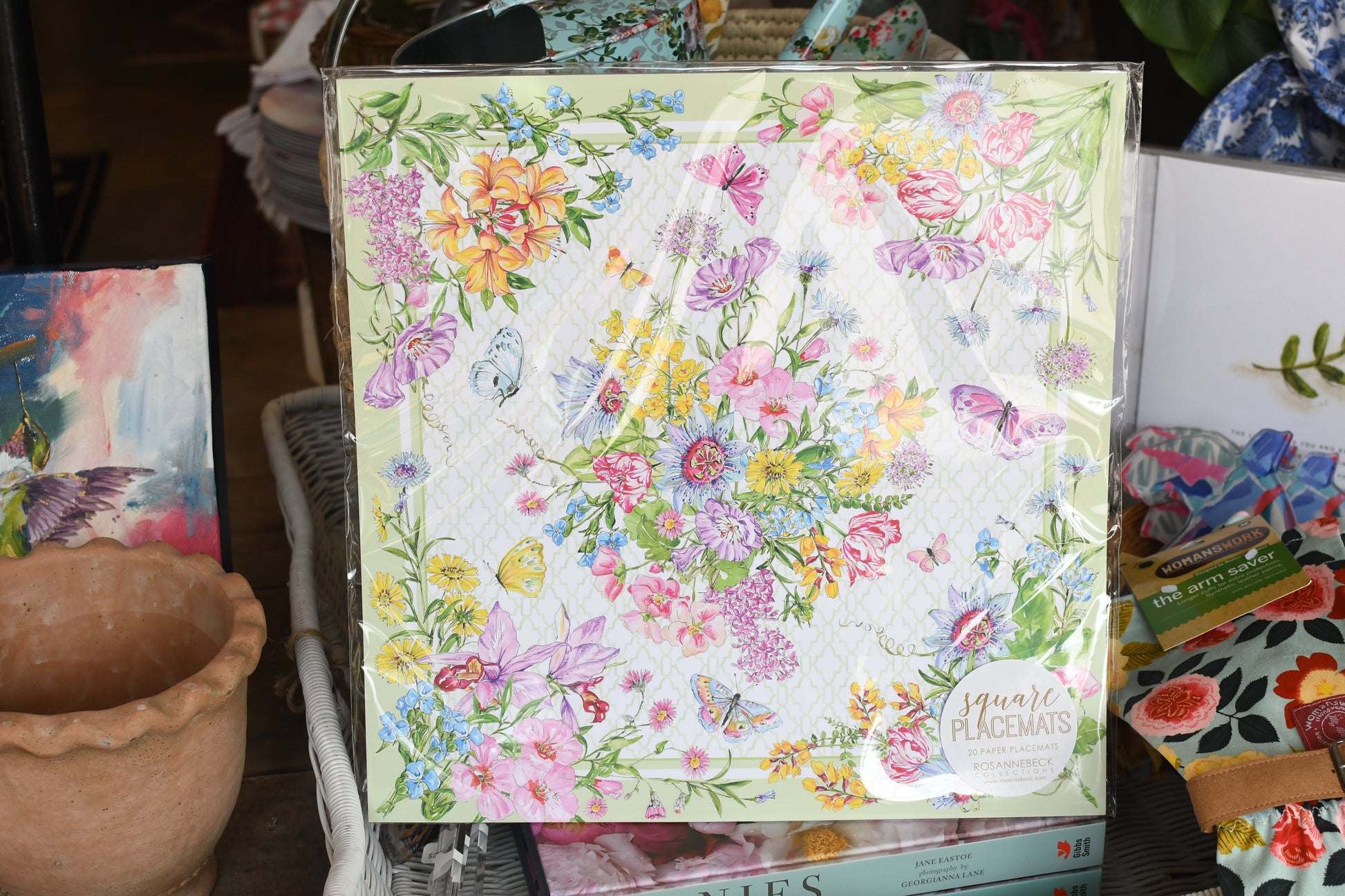 A set of 20 paper placemats with art by Rosanne Beck Her beautiful designs mix and match so well and set a gorgeous table! Search "Rosanne Beck" in our search bar to see all we have available.