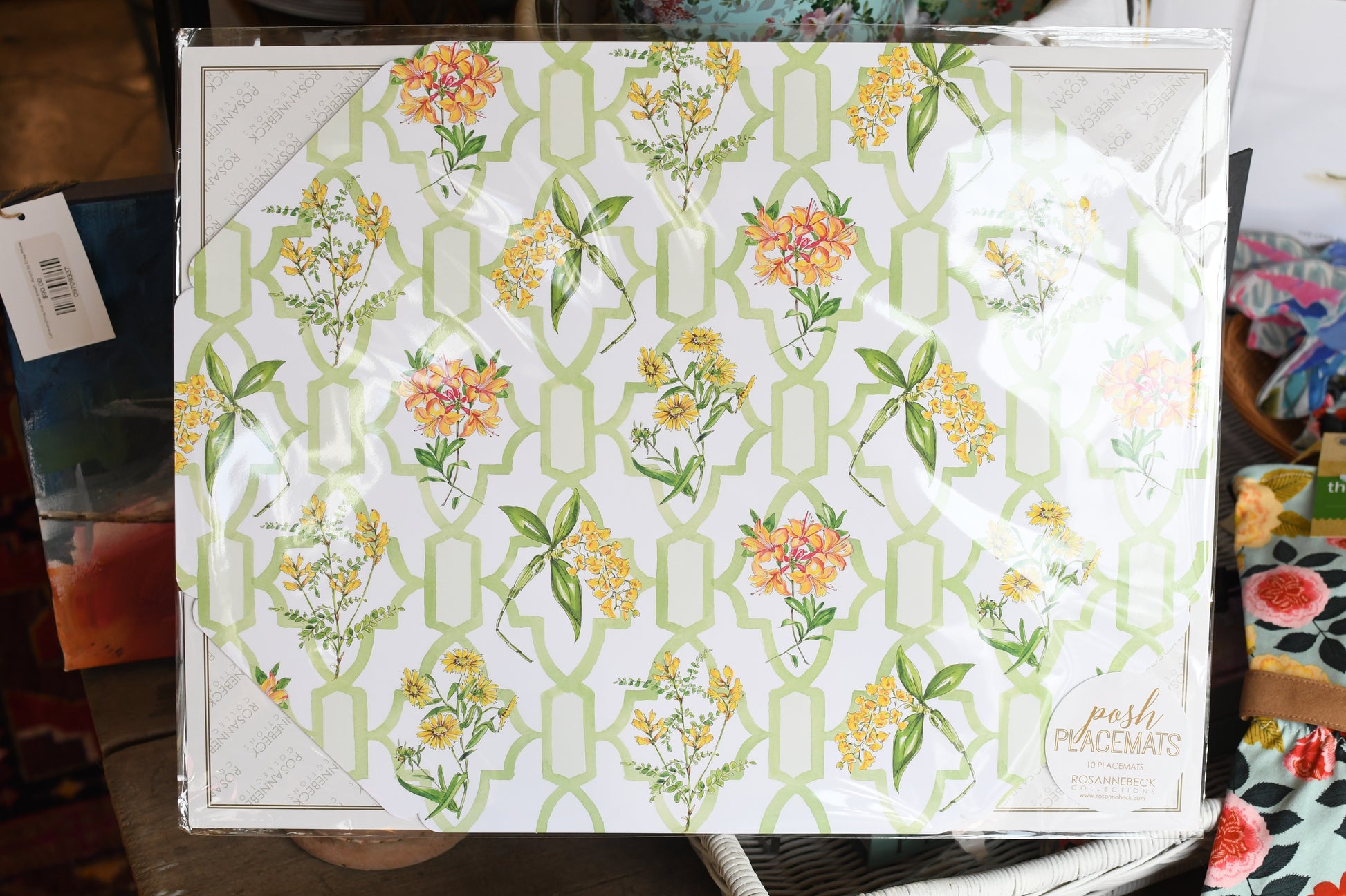 A set of 20 paper placemats with art by Rosanne Beck Her beautiful designs mix and match so well and set a gorgeous table! Search "Rosanne Beck" in our search bar to see all we have available.