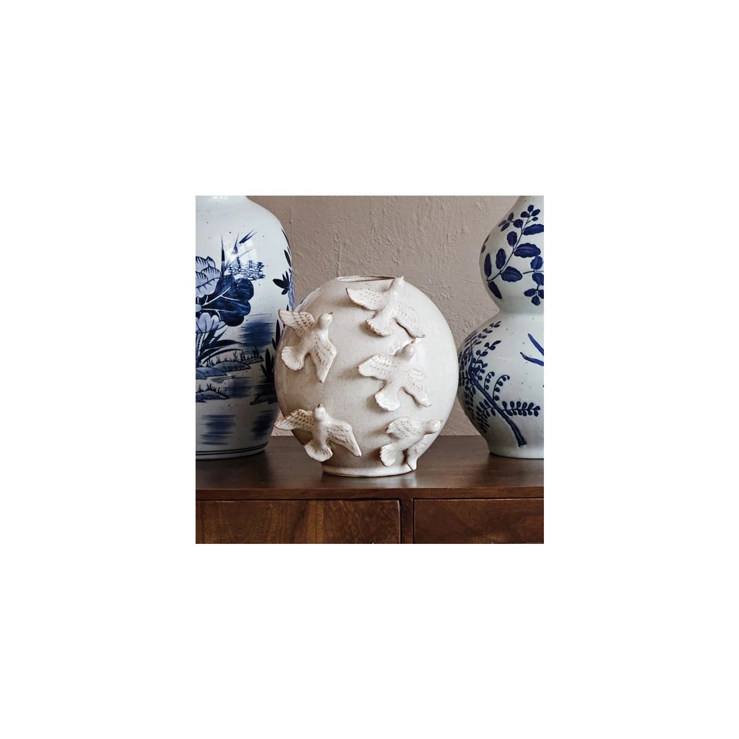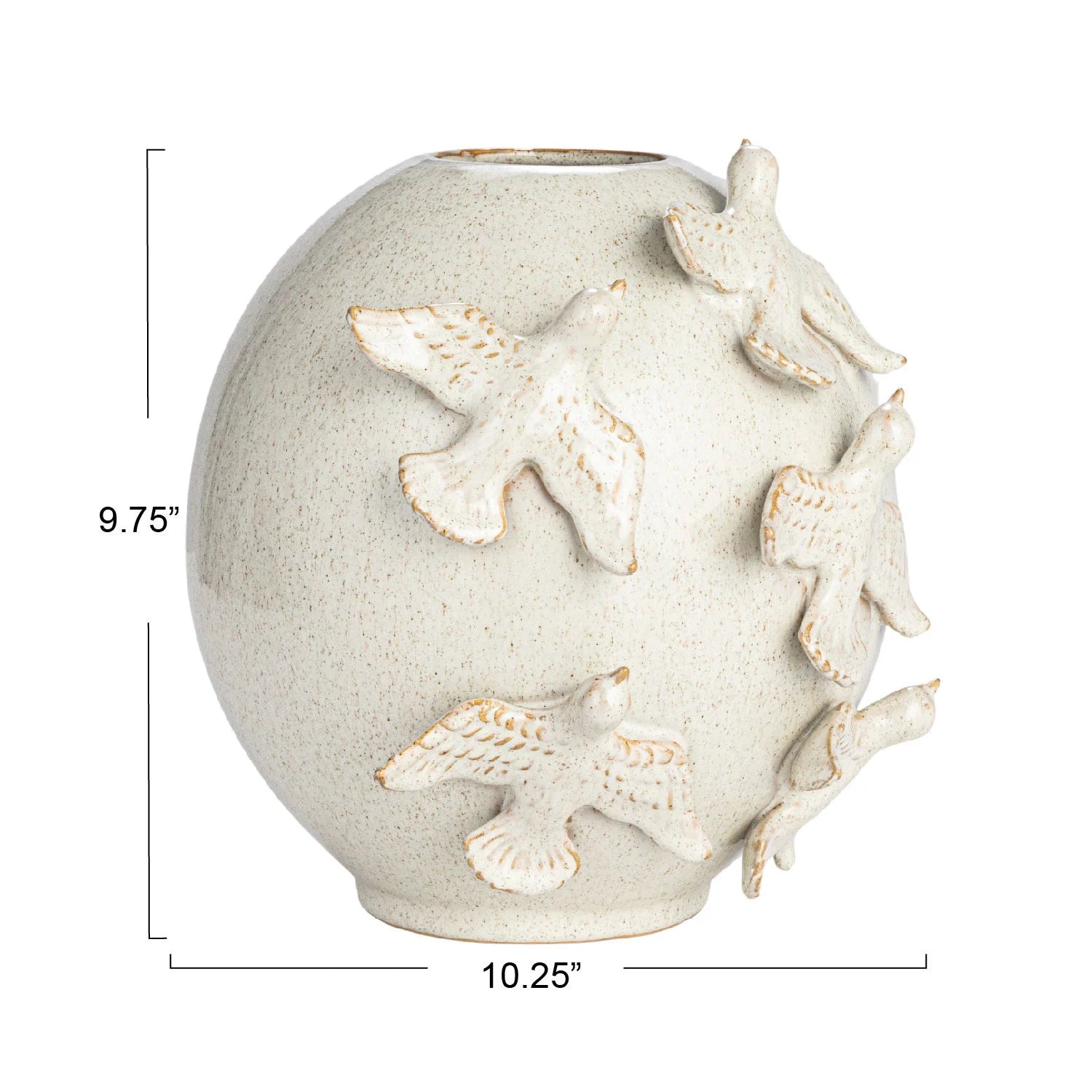 This stoneware vase is a delightful and whimsical piece, crafted from high-temperature fired ceramic. It features a round shape with a wide opening and two birds perched on the rim, giving it a playful and natural appearance. The vase's reactive glaze, a reaction with clay, creates subtle and elegant patterns on the surface, giving it a cream color. This vase can be used to display flowers, plants, or branches, or as a decorative accent. Place it on tables, shelves, mantels, or windowsills, and create a cozy and inviting atmosphere in the home. It's suitable for French country, modern farmhouse, garden, or coastal style, adding warmth and personality to any space. This vase is a perfect gift for those who appreciate art and nature.