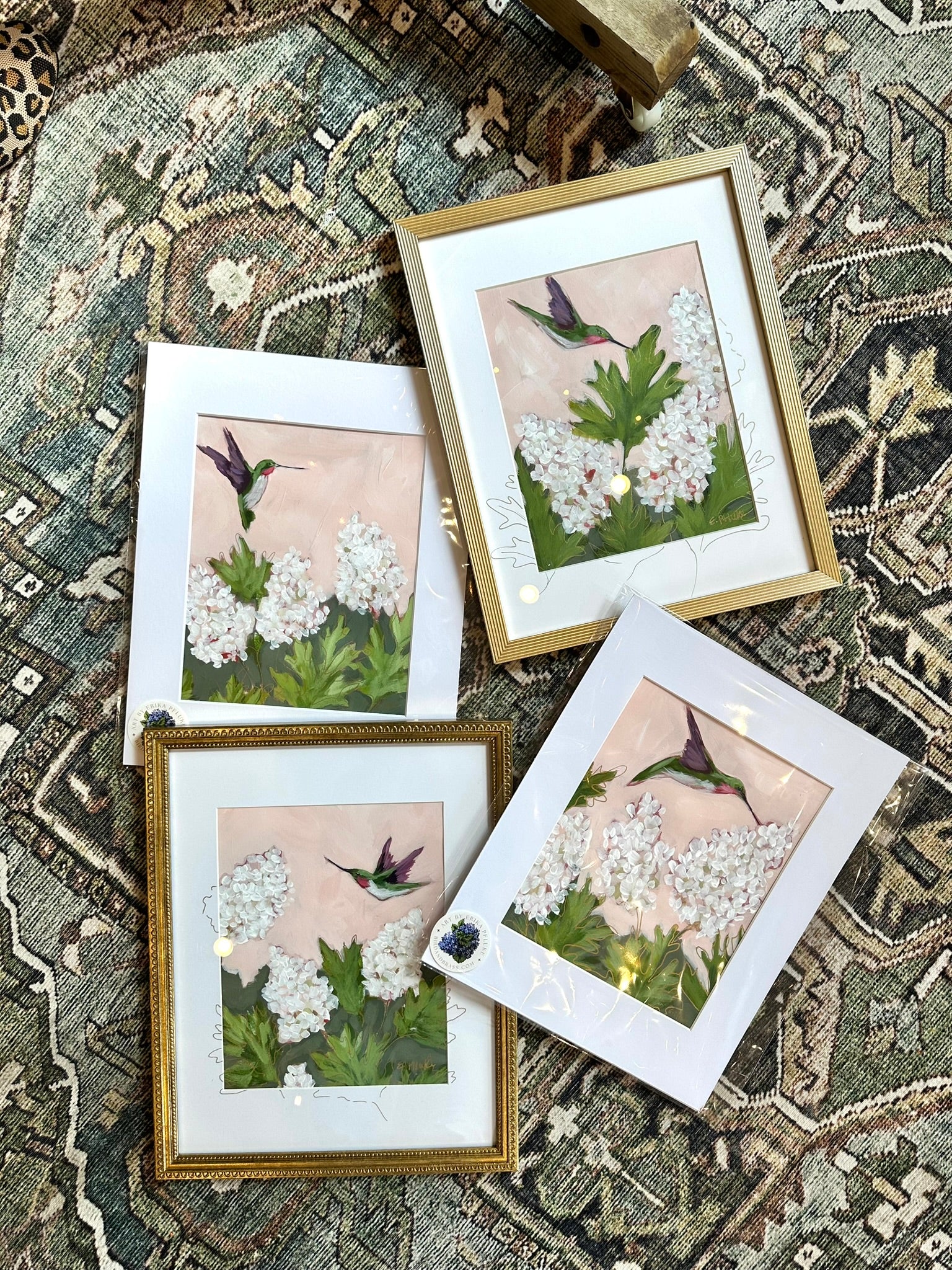 A joyful scene with a hummingbird visiting and oakleaf hydrangea. This is one of four paintings painted at the same time. Hung together, they may a beautiful collection. They can be hung separately or grouped together.
