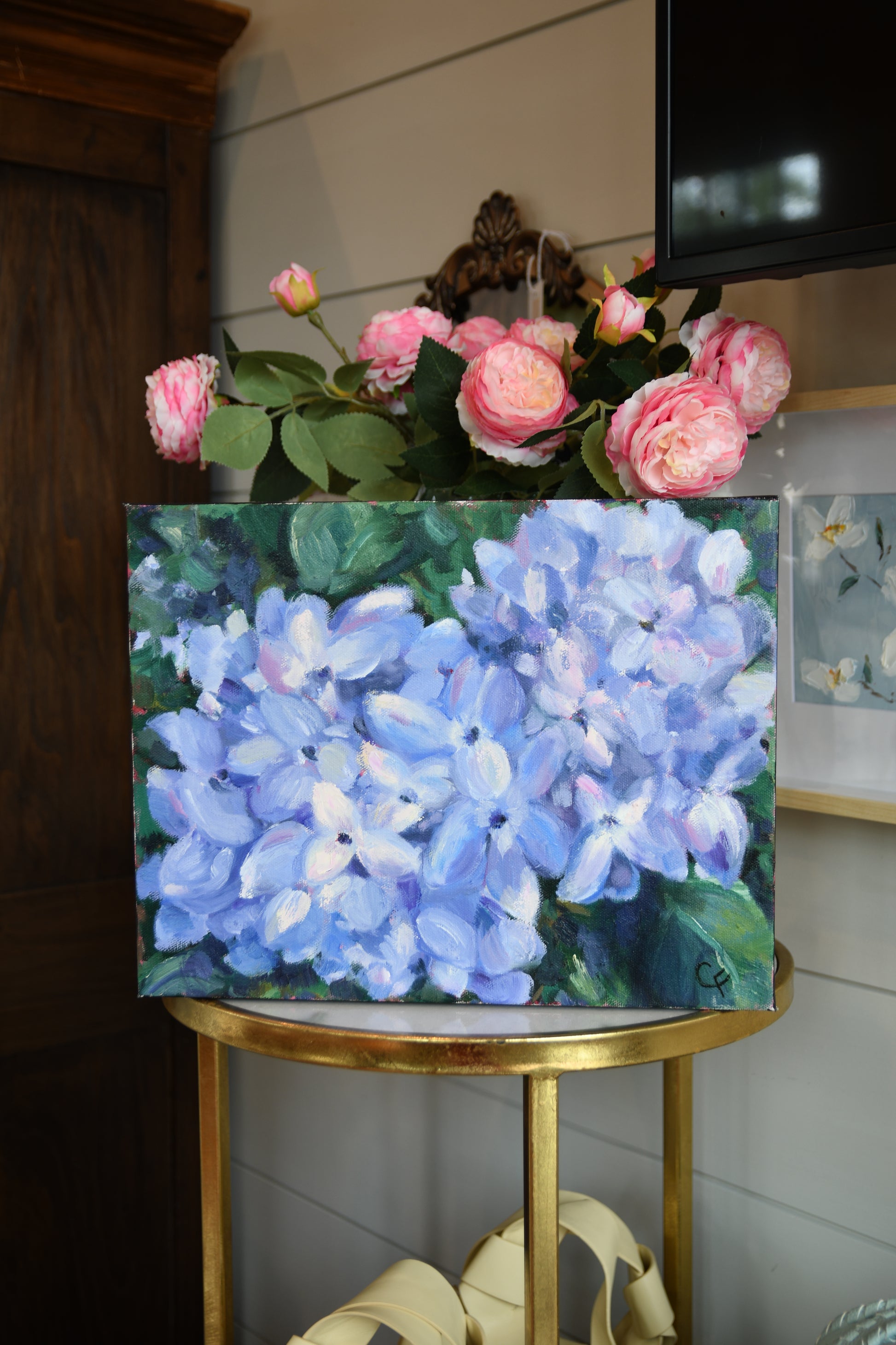 Hydrangeas in a vase with varying shades of blue. Oil on Canvas 14x11”
