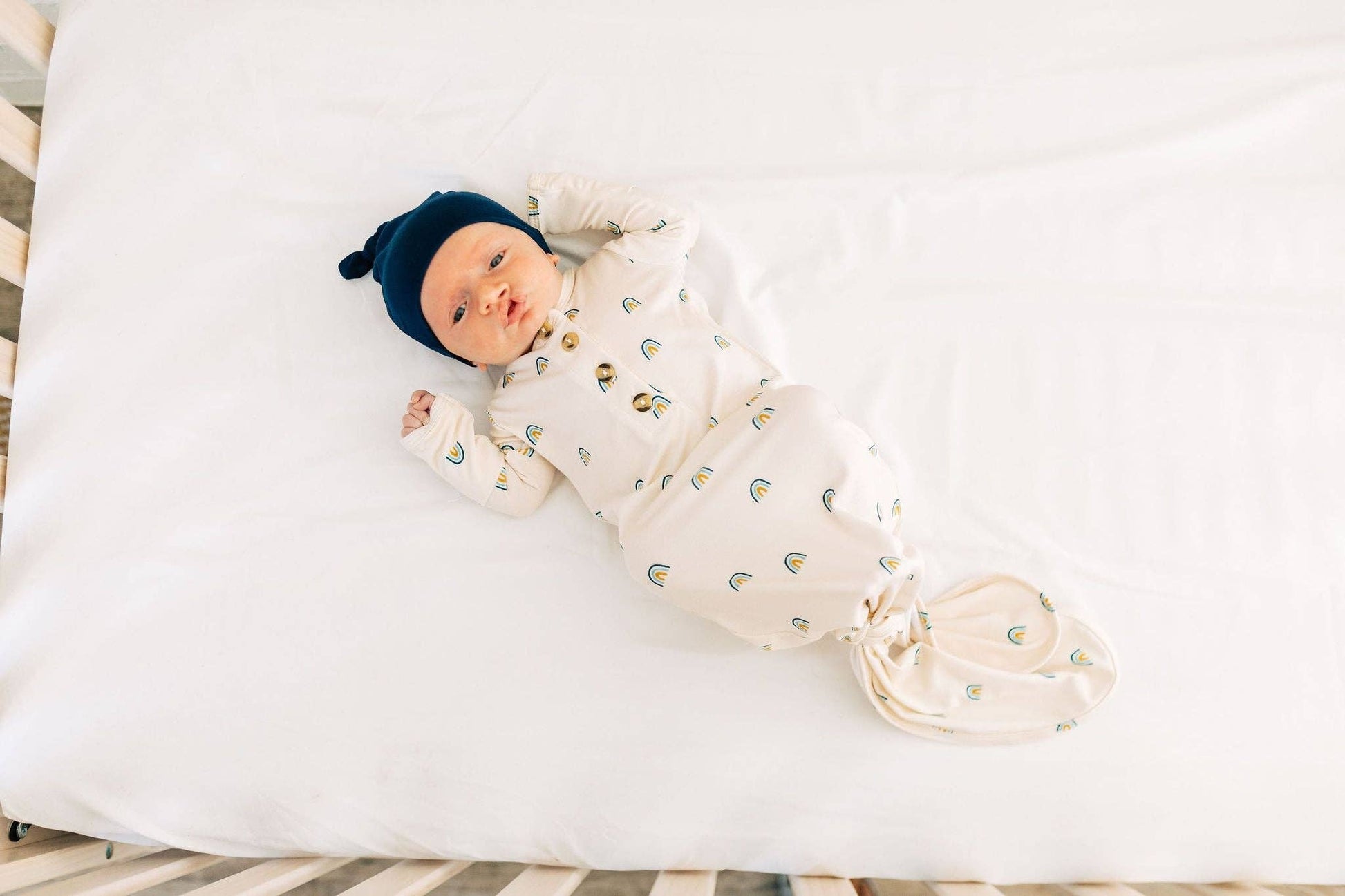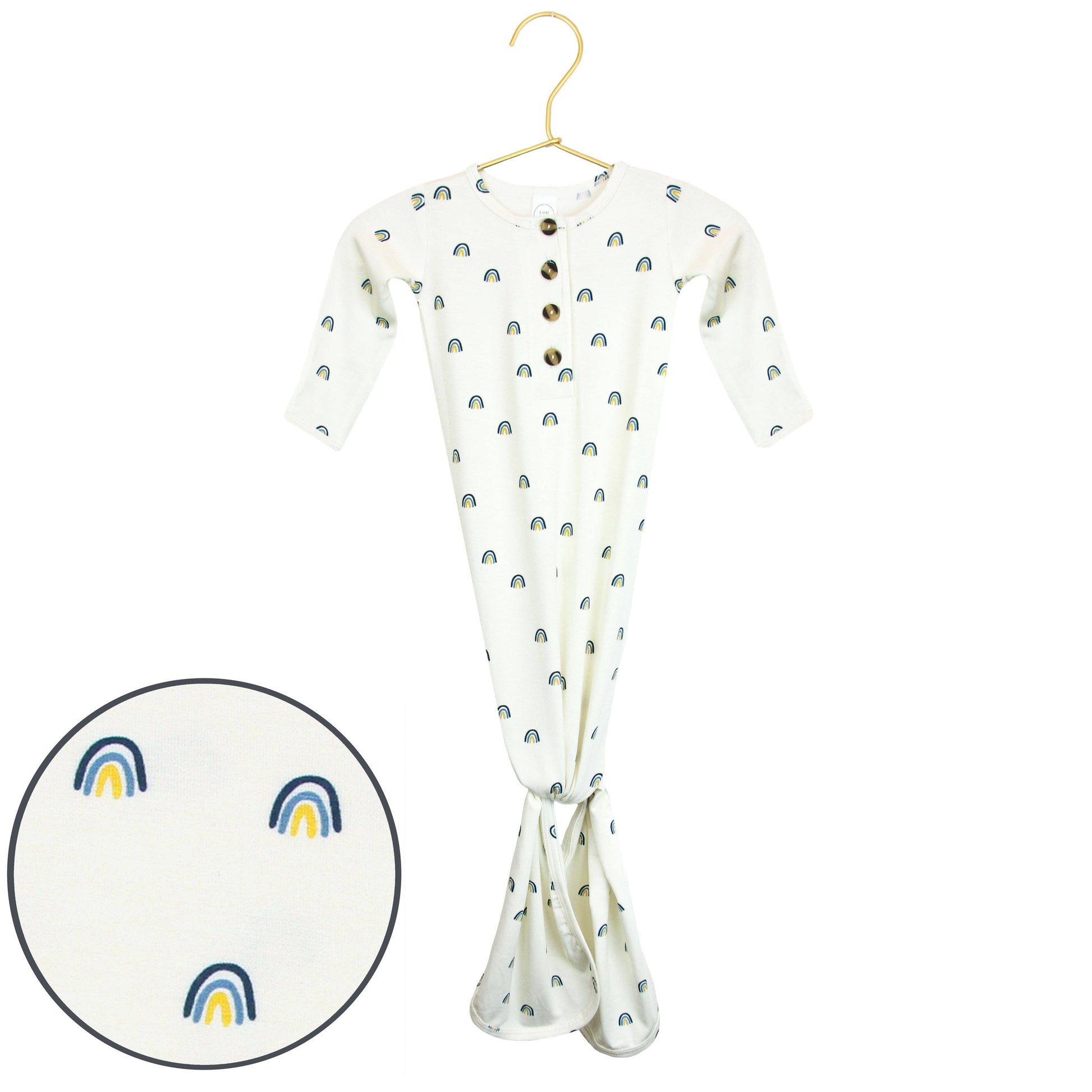 The easiest tie-bottom outfit for day or night. Made for hassle free diaper changes and gentle dressing, I designed this with a button-down front and tie bottom for simple closure (no more snaps at 2am!). Fold over wrist cuffs are the most thoughtful finishing touch.