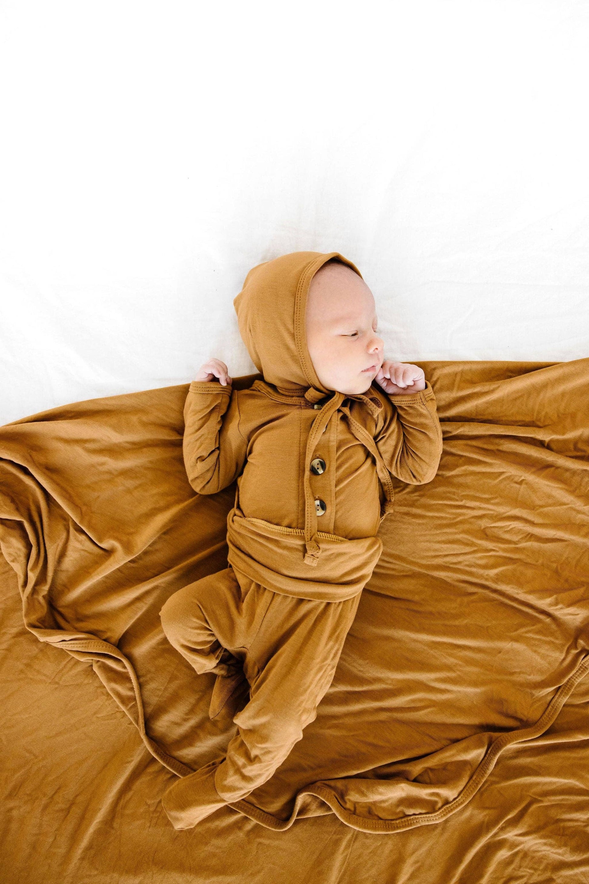 The easiest tie-bottom outfit for day or night. Made for hassle free diaper changes and gentle dressing, I designed this with a button-down front and tie bottom for simple closure (no more snaps at 2am!). Fold over wrist cuffs are the most thoughtful finishing touch.