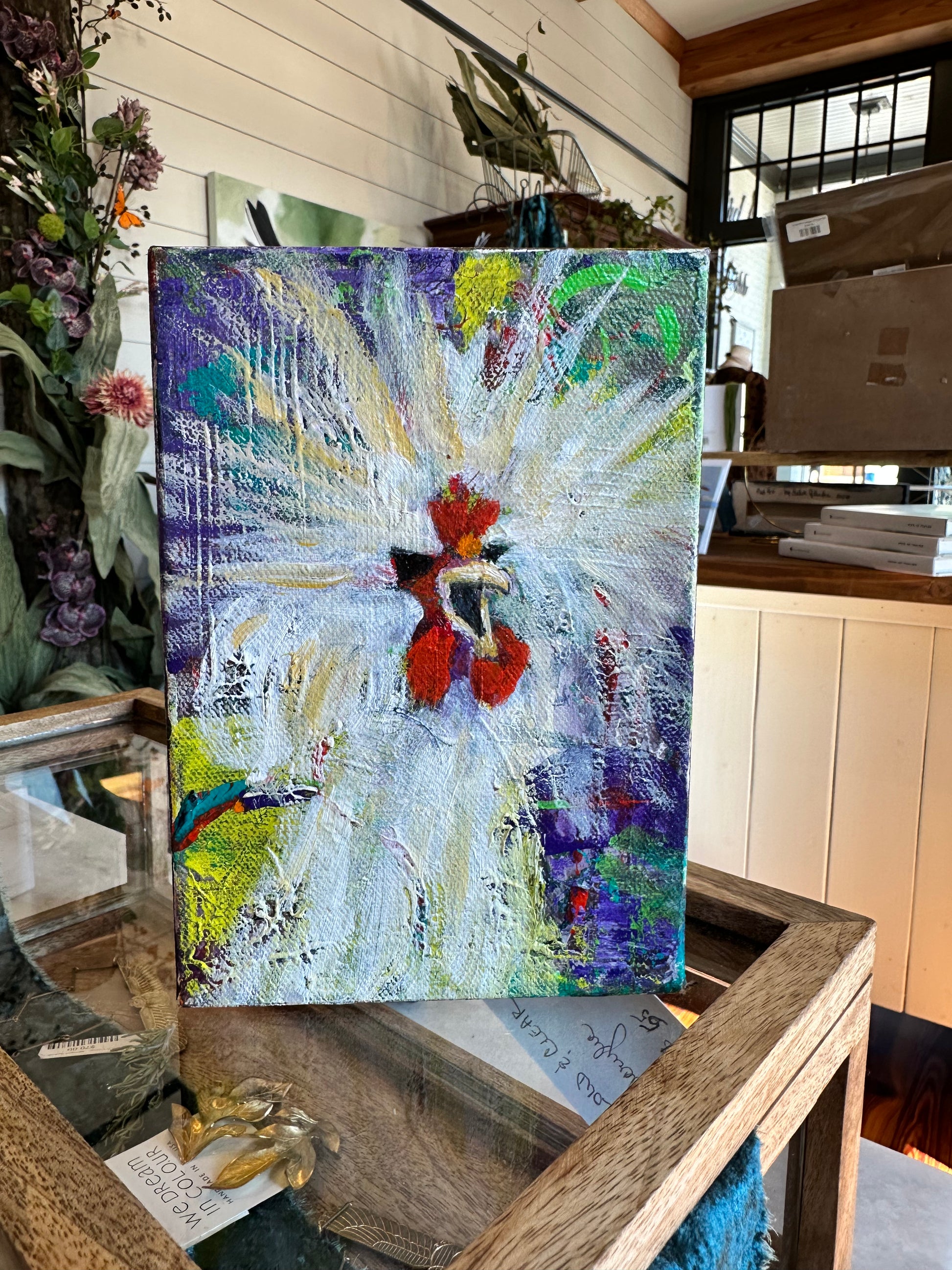 Acrylic, 5x7, original artwork by local artist Leslie Moody. Playful and brightly colored, this silly bird is making a statement.