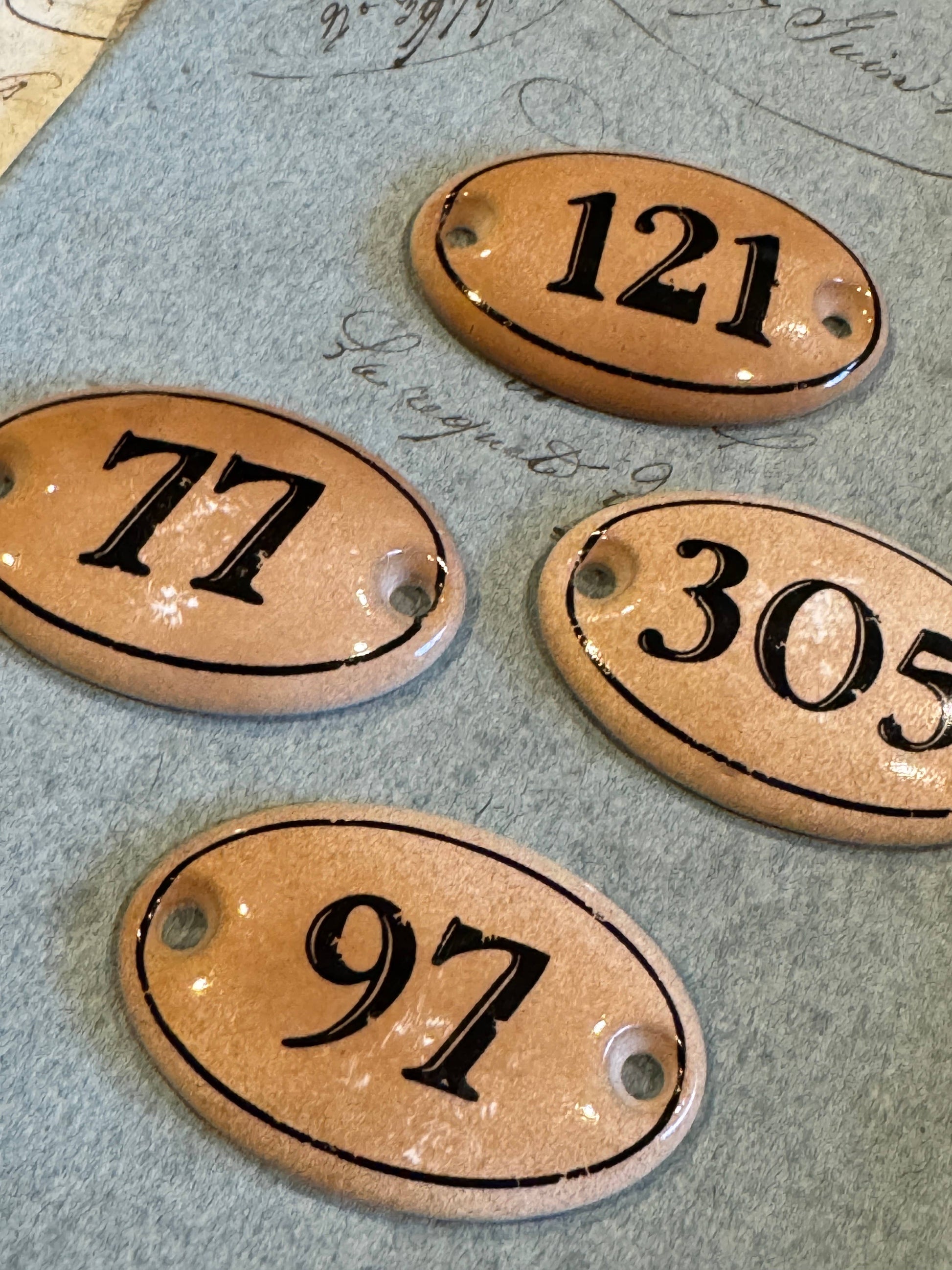 Reproduction porcelain bisque tags/numbers based on French antiques. These are pretty oval pieces, each individually numbered. They are white porcelain with one hole on each side. The dimensions are approximately 2.6" wide and 1.3" tall. These are perfect for furniture as well as mixed media. These pieces can also be aged with a floral spray stain, as shown.