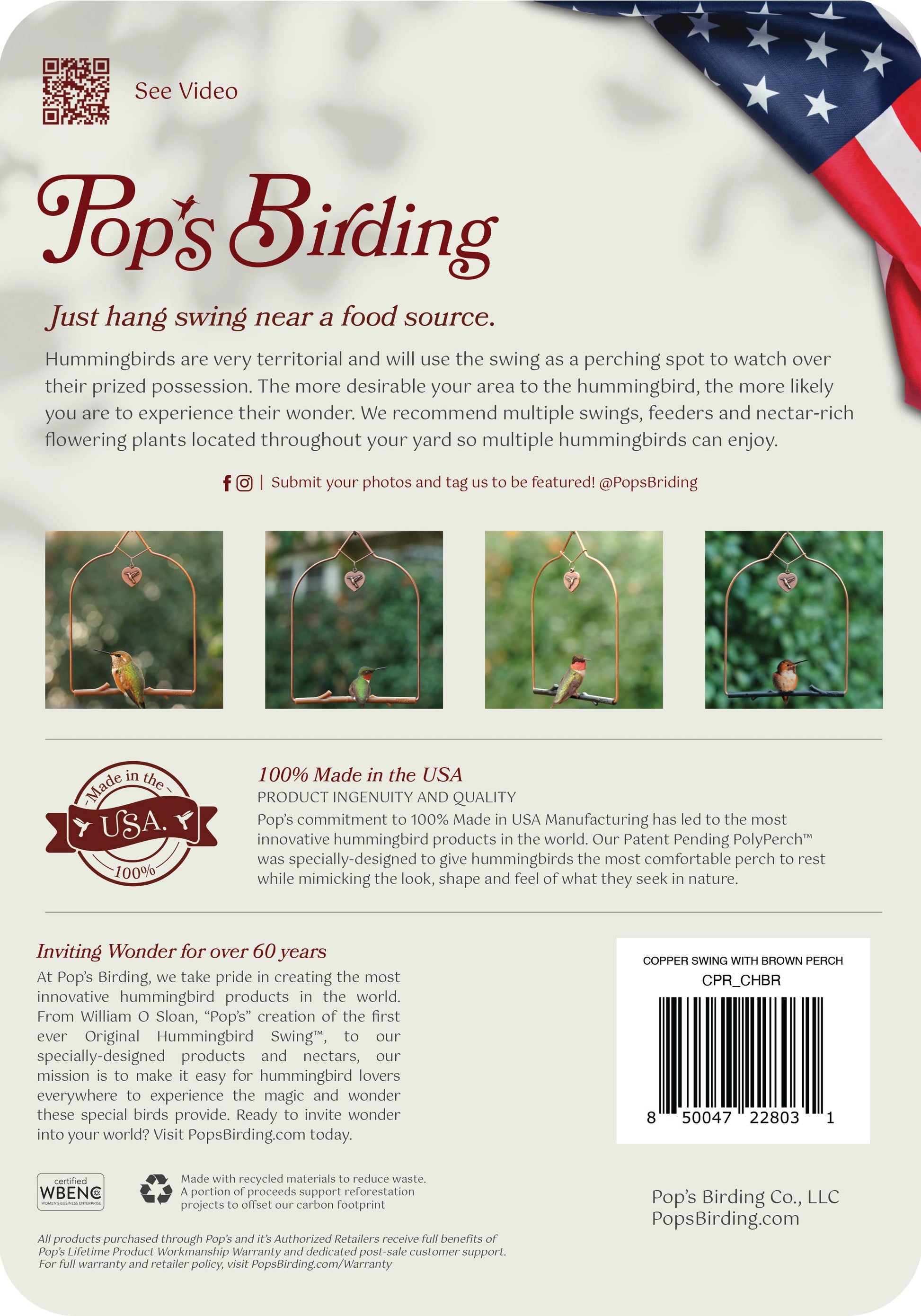 Pop's commitment to 100% Manufacturing in the USA brings a bold refreshed look to our most popular Copper Series Swing. The elegant design features a pronounced hang port with complementary charm for picture perfect, 'hummingbird-framing' photography.