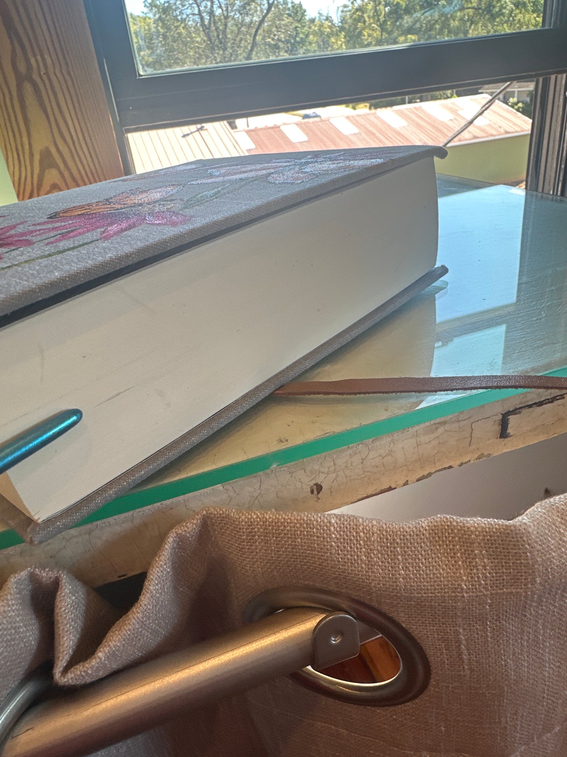 Hand painted NKJV Bible. This Bible features a gray cloth exterior with an attached leather cord to wrap around the Bible. Monarchs and pink cone flowers decorate the front and back cover. Inside this journaling Bible, there is room on the other side of each page to write your thoughts.