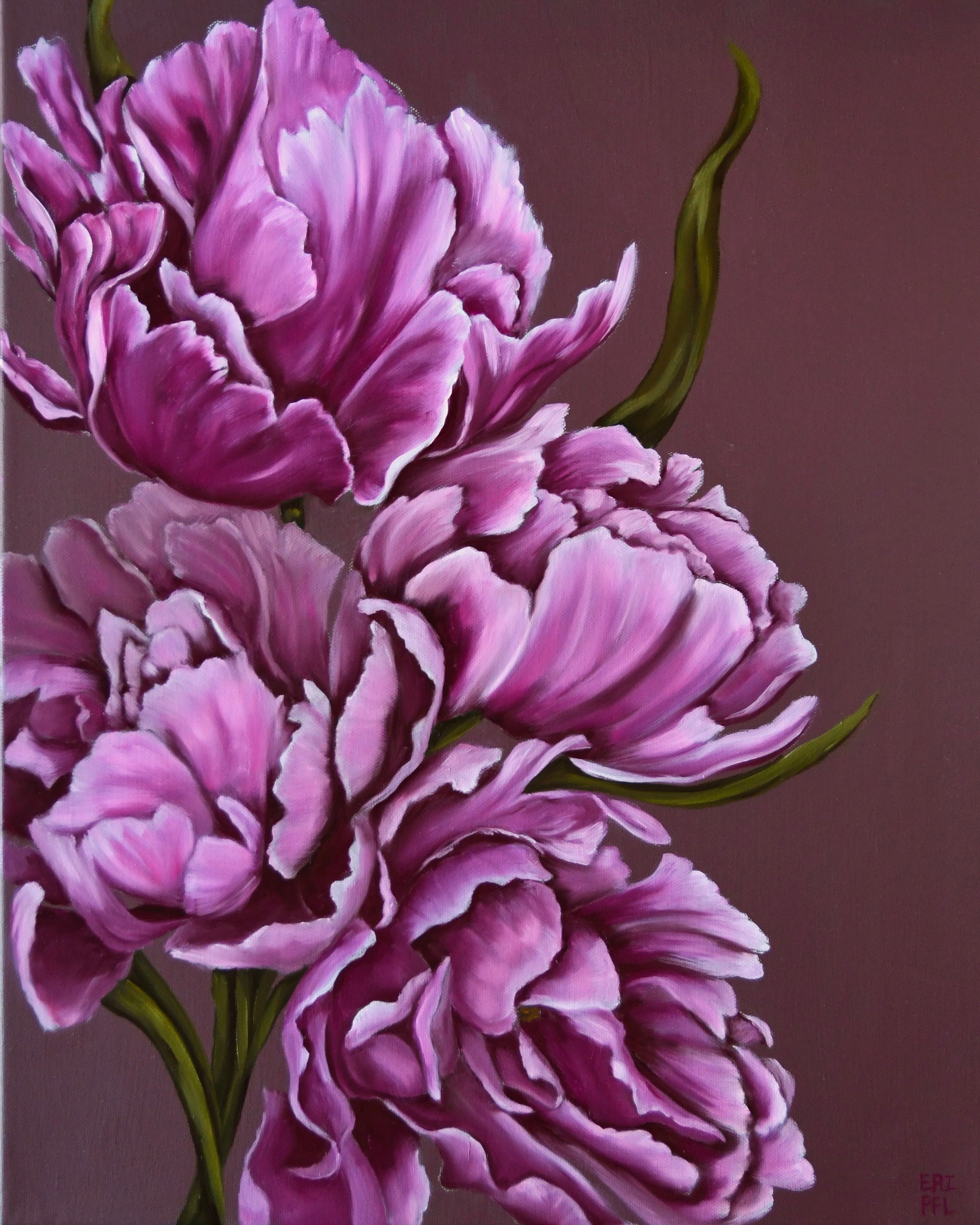 Showy and dramatic, these tulips will elevate any space. They are painted on a 16x20x.5” canvas. We can help with simple framing options too.