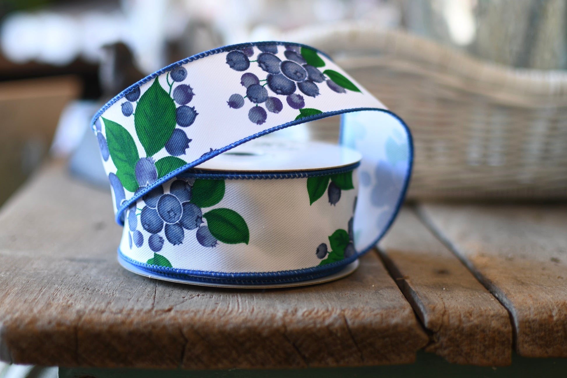 Fresh, ripe blueberries are a true summertime treat! And so is this ribbon with stems of blueberries printed against a pure white background. The wired edge is finished in a contrasting shade of blue. Perfect for wrapping a special gift, making wreaths, or other decor needs. $2 per yard, White, 1-1/2 Inch, Fiber Content: 100% POLYESTER