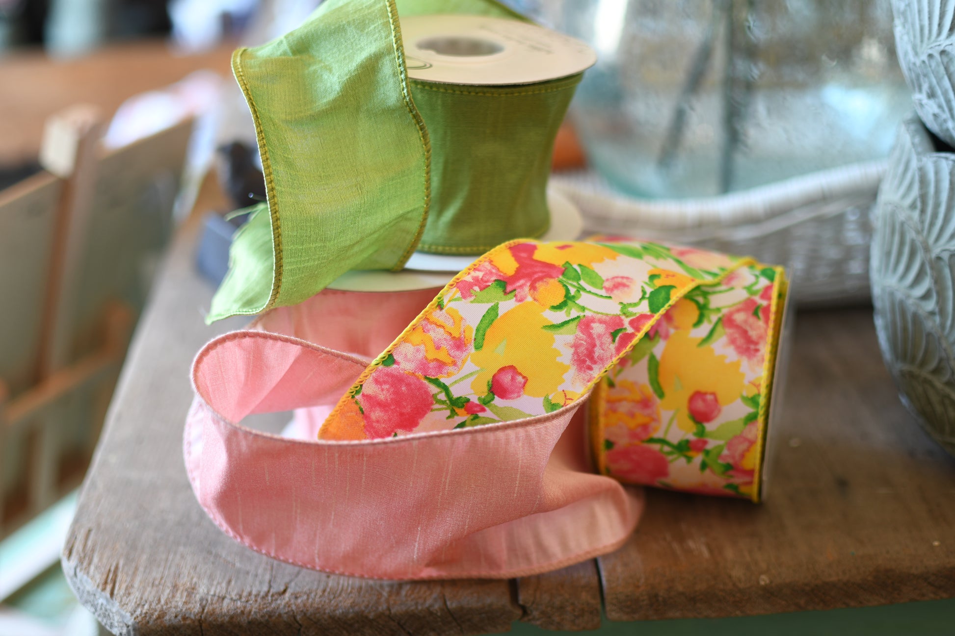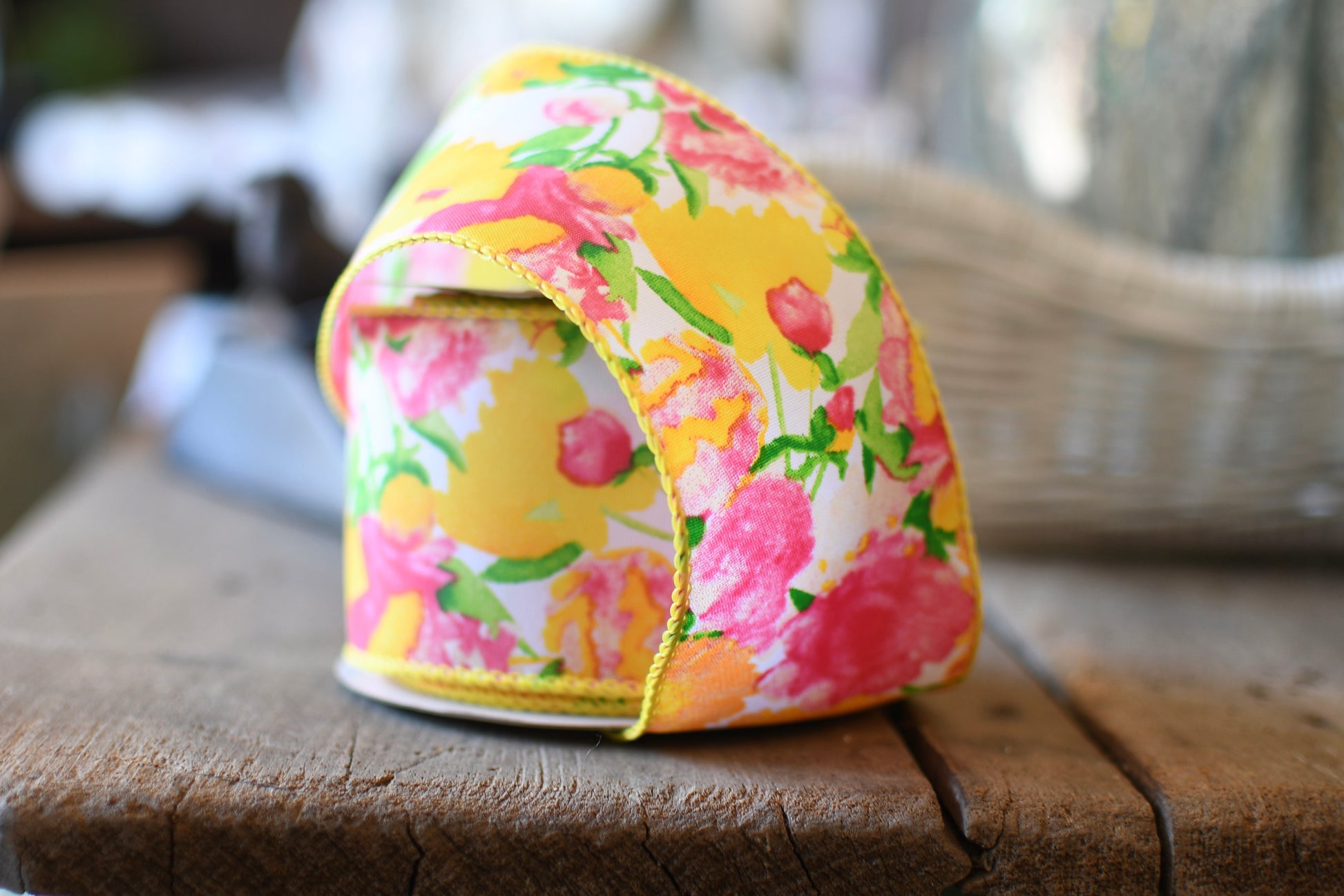 Bold yellow and pink flowers with a watercolor design adorn this ribbon. This wired ribbon is an ideal embellishment to add color to floral creations, wreaths and more. 2-1/2 Inch, Fiber Content: 100% POLYESTER $3.75 per yard