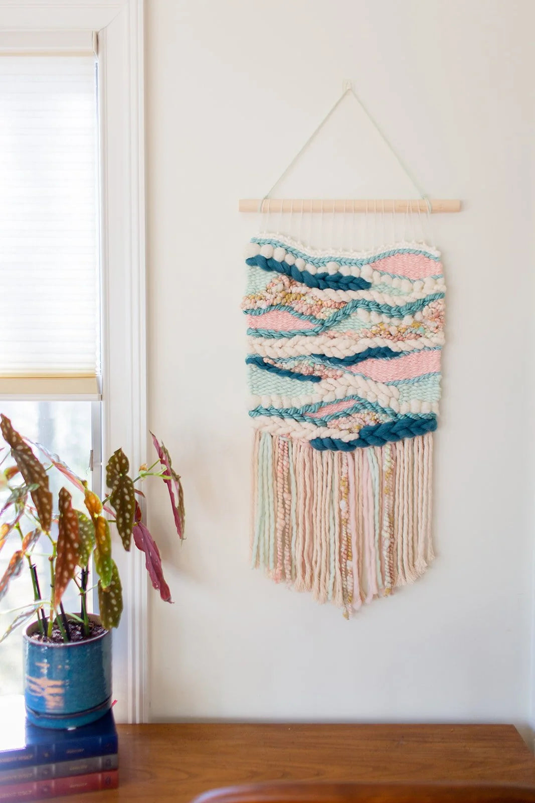 Handwoven wall tapestry made with synthetic and natural fibers, including wool, cotton, silk, linen, banana fiber, repurposed fabrics, hand dyed and hand spun yarns and more.