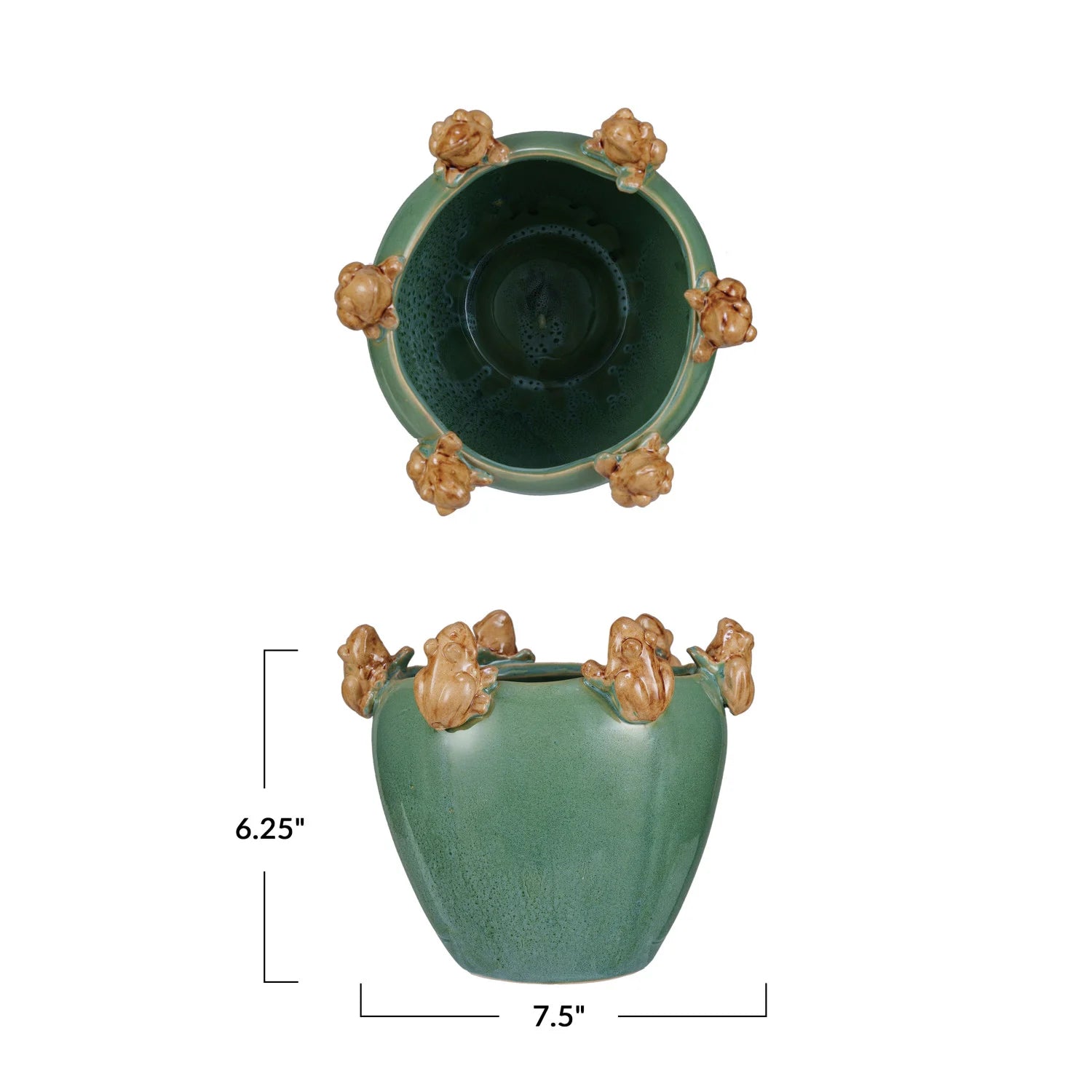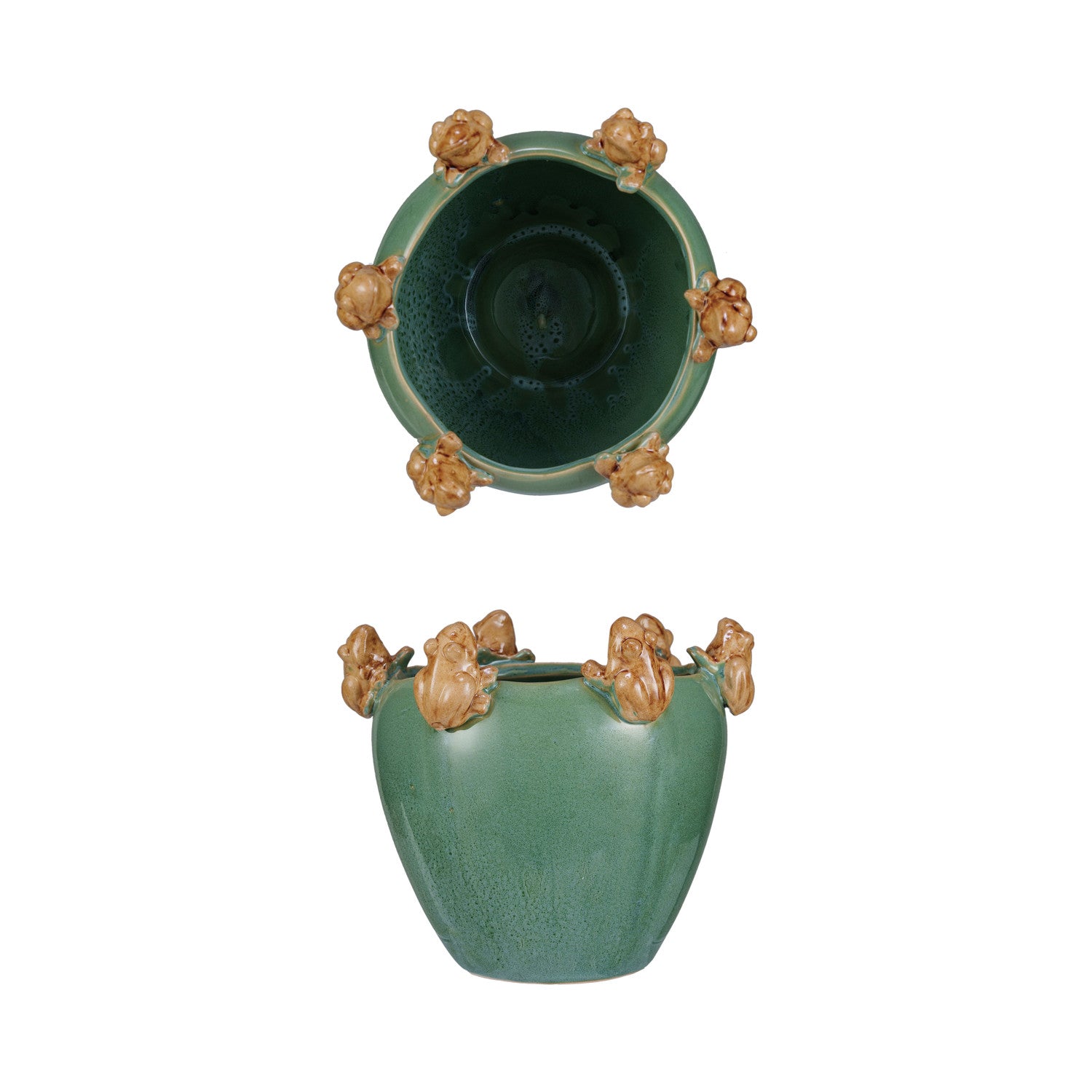 Bring some fun and freshness to the indoor or outdoor space with this stoneware planter with frogs on rim. This planter features a round shape and a smooth texture, with two adorable frogs sitting on the edge of the rim. The planter has a reactive glaze finish that gives it a stunning and unique look, with shades of green and yellow blending together in a beautiful pattern. The planter is made of high-quality stoneware that is durable and easy to clean and can hold a 6-inch pot of the choice. Whether plant some herbs, flowers, or succulents, this planter will make them look even more attractive and lively. This planter is ideal for adding some farmhouse garden cottagecore style to the home and will surely brighten up any corner with its cute and colorful design.