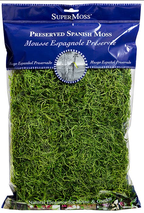 SuperMoss Preserved Spanish Moss is a company staple. It grows in a swirly, spaghetti-like fashion and makes for an excellent touch to floral displays, creative projects, and your garden. Our product is responsibly procured and comes in its natural color as well as a variety of enhanced colors to match your home decor. Our product is durable and reliable to provide long-lasting beauty. It is ideal for covering soil or dressing container plants, bulbs & orchids. Spanish Moss is also a great natural fill for gift baskets. *Cleaned before packaging to remove small particles.