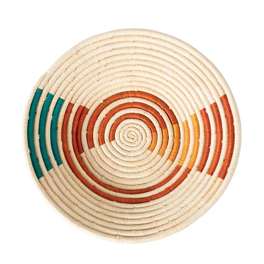Handwoven by women artisans in Uganda, the Asymmetric Basket is an exquisite example of Ugandan basket weaving using raffia and banana stalk. The modern design, mimicking sound or radar in motion, in natural raffia, rust and teal colors, could earn it a feature spot in a boho wall installation, or as a unique tabletop catch‒all.