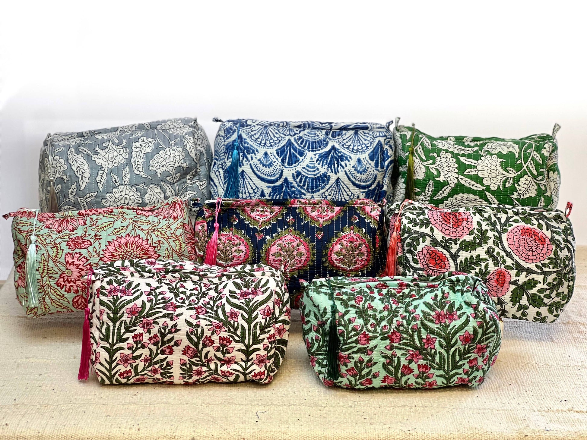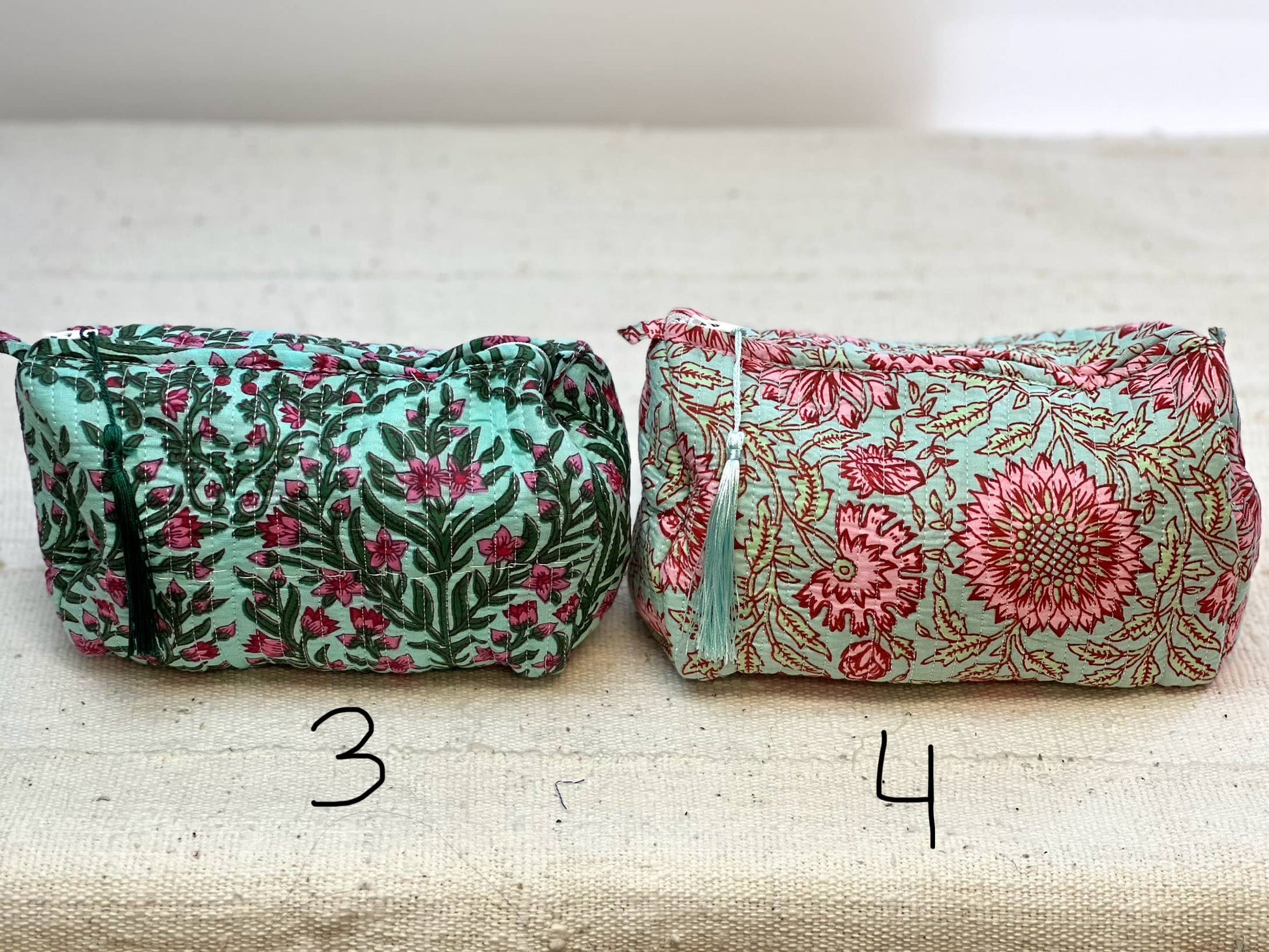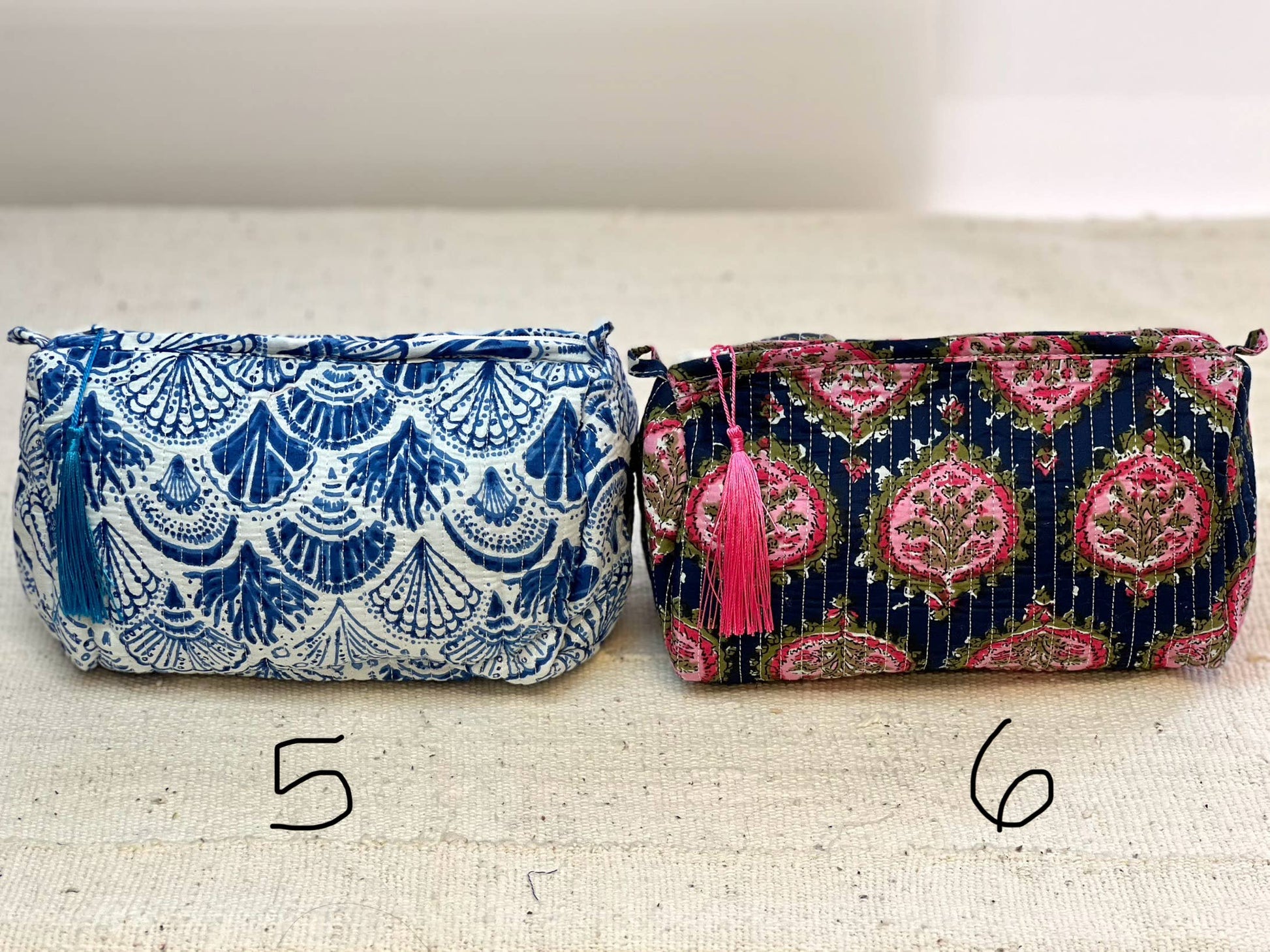 Block print cosmetic/toiletries bags in variety of prints. Prints are numbered in the photos to correspond with the selection from the drop down menu.