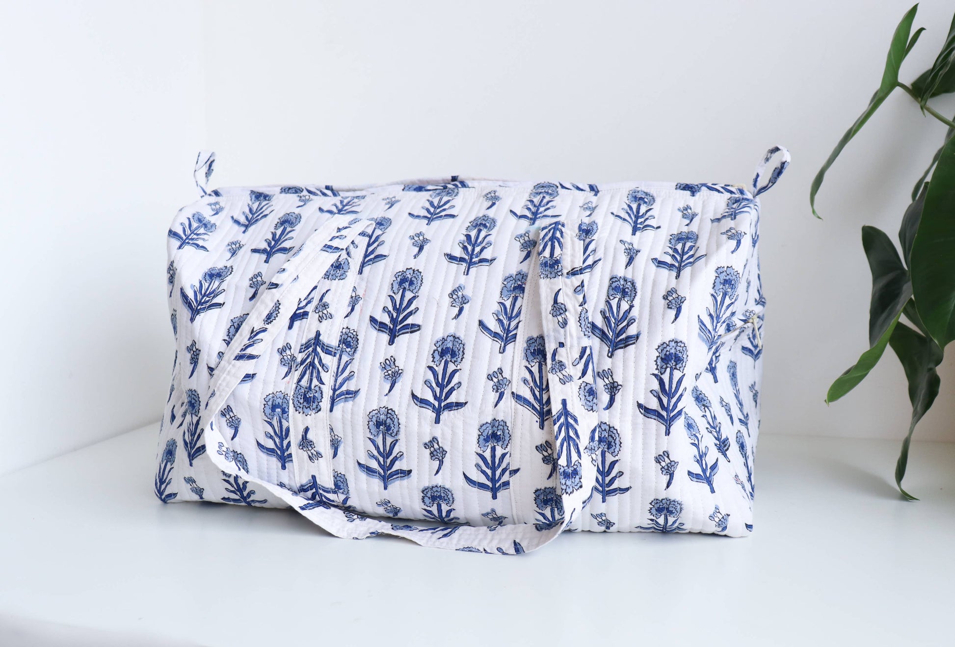 Floral Duffle Bag- Women Weekender Bag- Quilted Overnight bag - Blue Travel bag - Cotton Baby Bag- Large Gym Bag- Hospital Bag - Baby Shower
