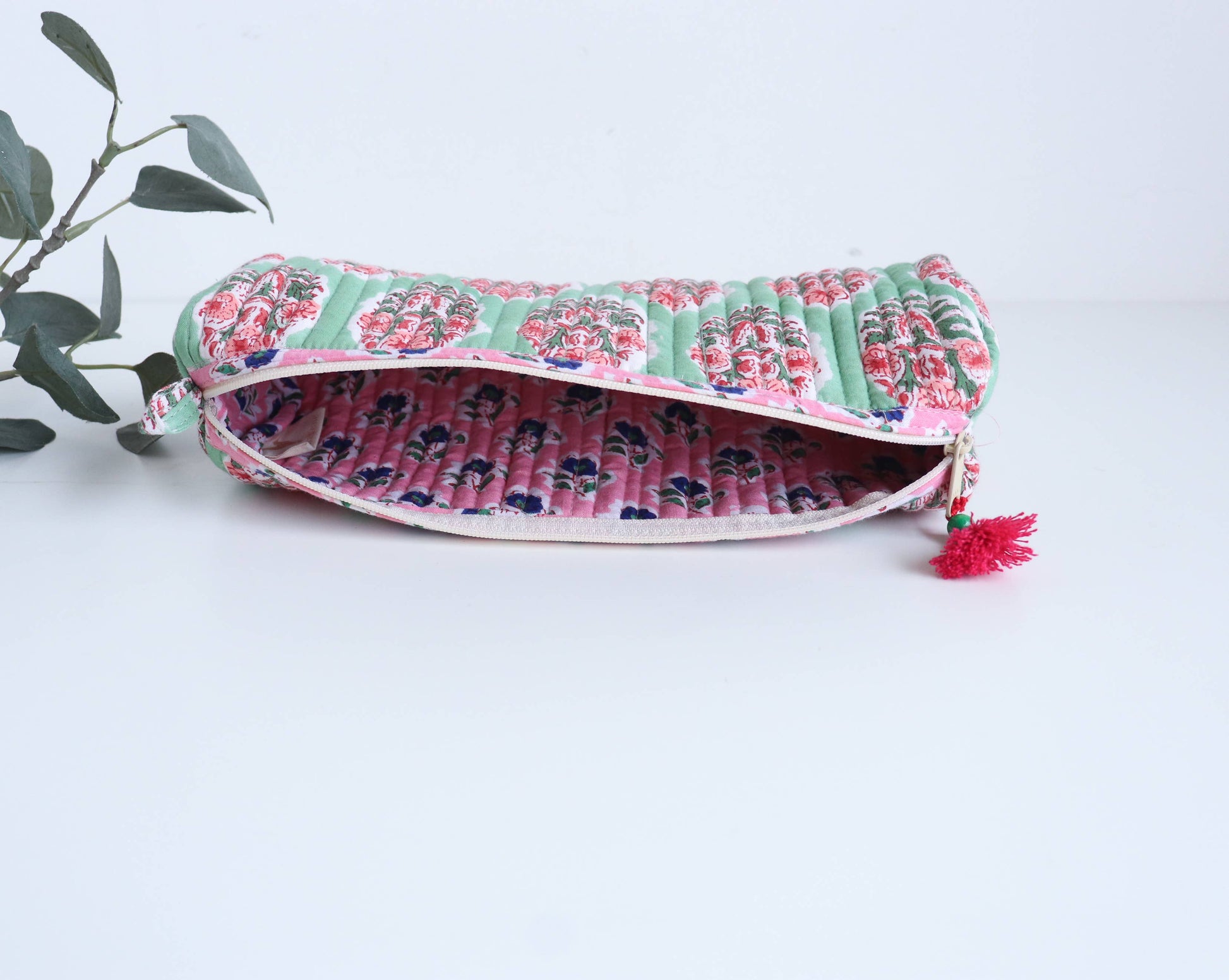 The Floral Pouch is designed with a vibrant hand-block printed floral pattern on the outside and a coordinating block-printed lining on the inside. Each pouch is thoughtfully finished with loops on both sides and a charming bead tassel trim on the zipper pull, making it as functional as it is beautiful!